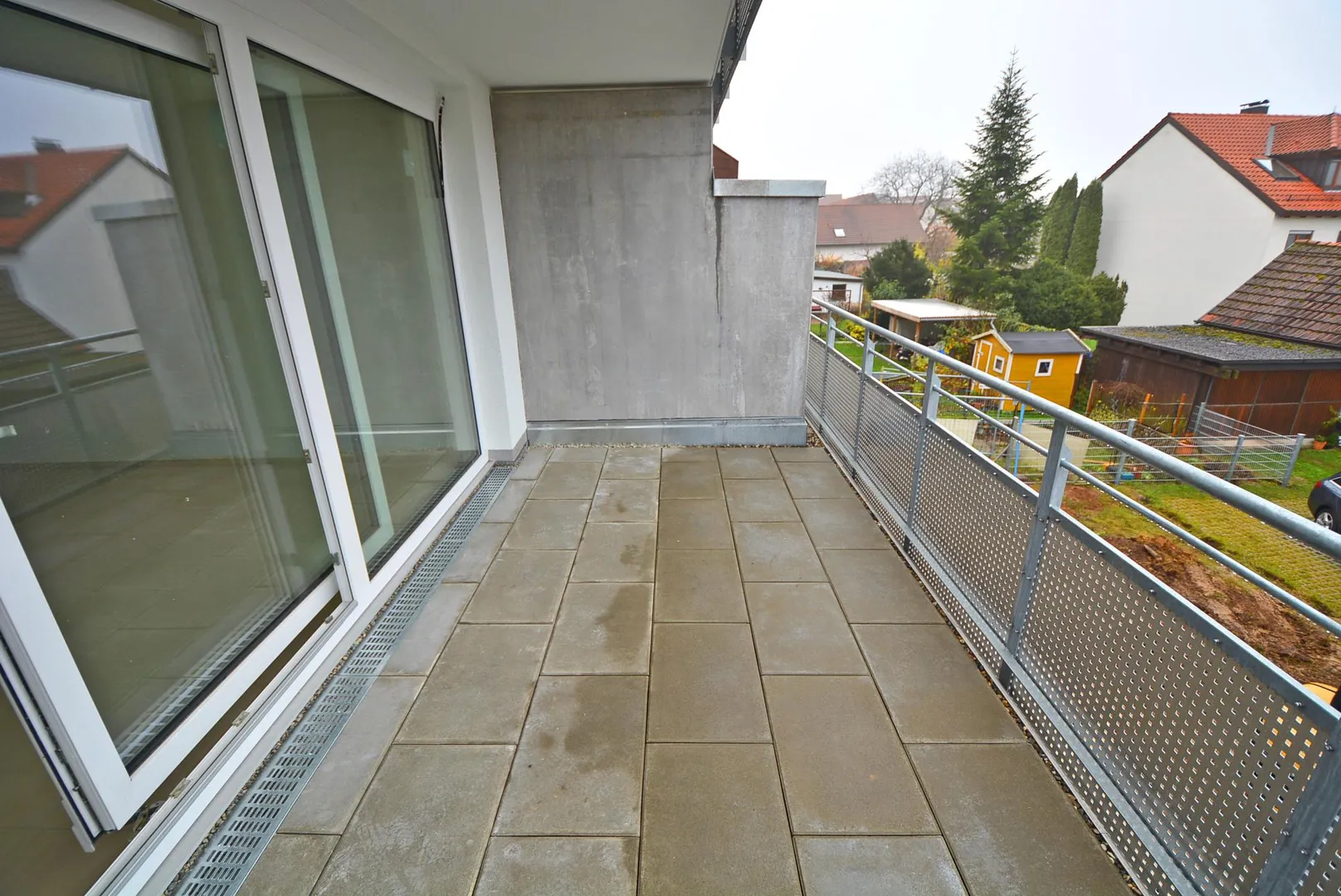 Der ca. 11 m² große und teilüberdachte Süd-Balkon ist vom Wohn-/Essbereich zugänglich.