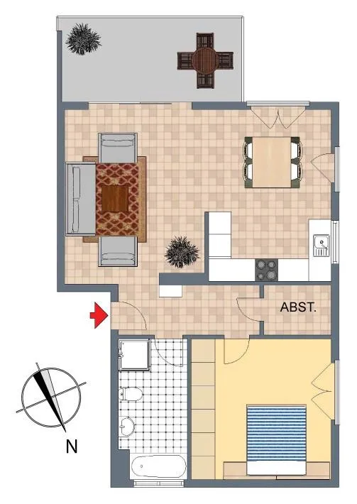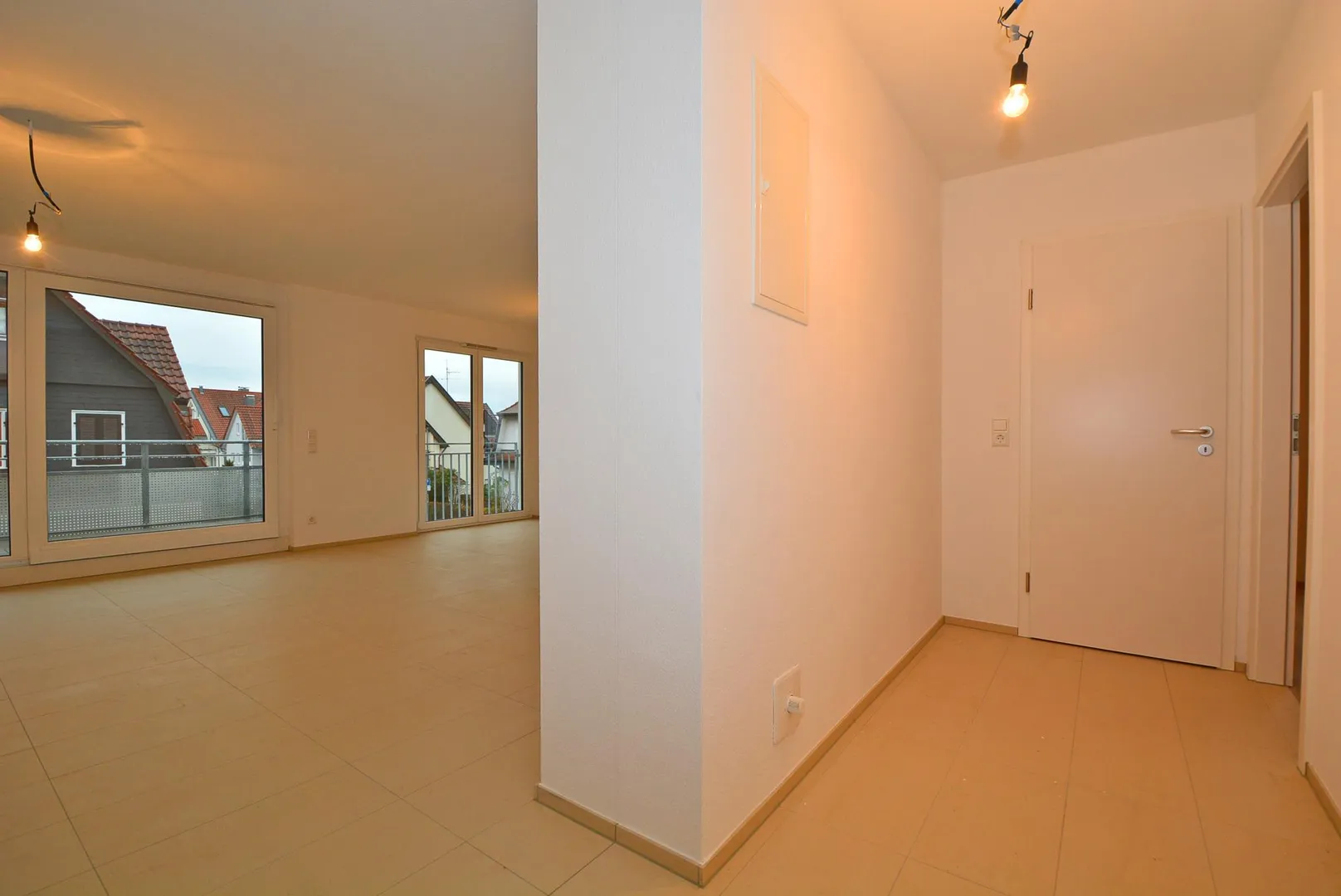 Die Wohnung ist offen gestaltet. Der Eingangsbereich ist zum Wohnbereich hin offen. Die offene Küche ist mit dem Wohn-/Essbereich verbunden. Das Badezimmer ist mit einem Fenster ausgestattet. In der Wohnung befindet sich ein ca. 3 m² großer Abstellraum.