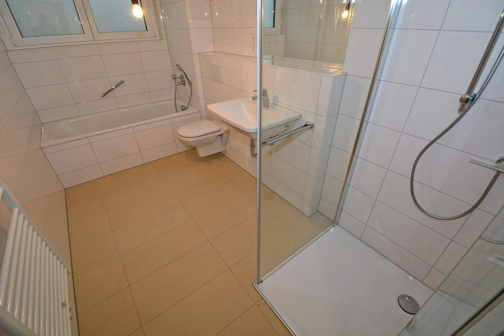 Das raumhoch geflieste Tageslicht-Badezimmer ist ausgestattet mit einer Badewanne, einer Dusche, einem Waschbecken mit Spiegel, einem Handtuch-Heizkörper sowie einem WC.