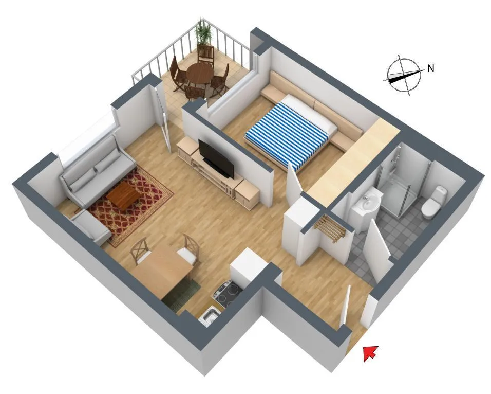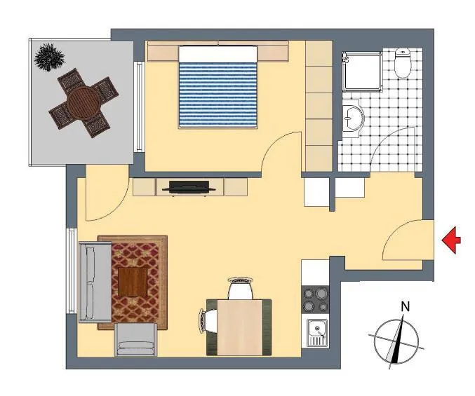 Vom Wohnzimmer ist der überdachte, ca. 6 m² große Süd-West Balkon zugängig.
