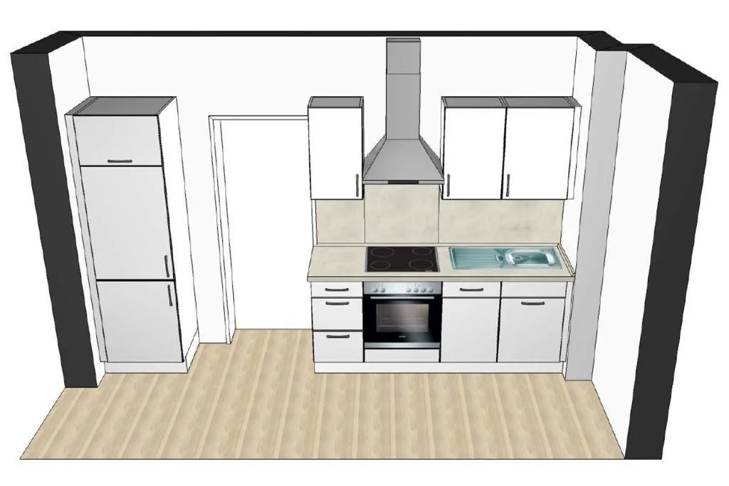 Im Wohnbereich befindet sich die offene Küche mit Einbauküche. Die Einbauküche ist ausgestattet mit Kühlschrank mit Gefrierfach, Herd mit Backofen, Dunstabzugshaube, Spülmaschine, Ober- und Unterschränke.