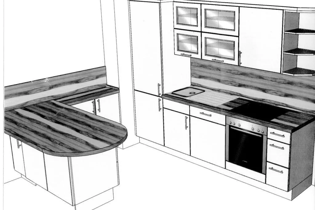 Im Wohnbereich befindet sich die offene Küche mit Einbauküche. Die U-förmige Einbauküche mit Essbereich ist ausgestattet mit Kühlschrank, Gefrierschrank, Herd mit Backofen, Dunstabzugshaube, Spülmaschine, Ober- und Unterschränke.