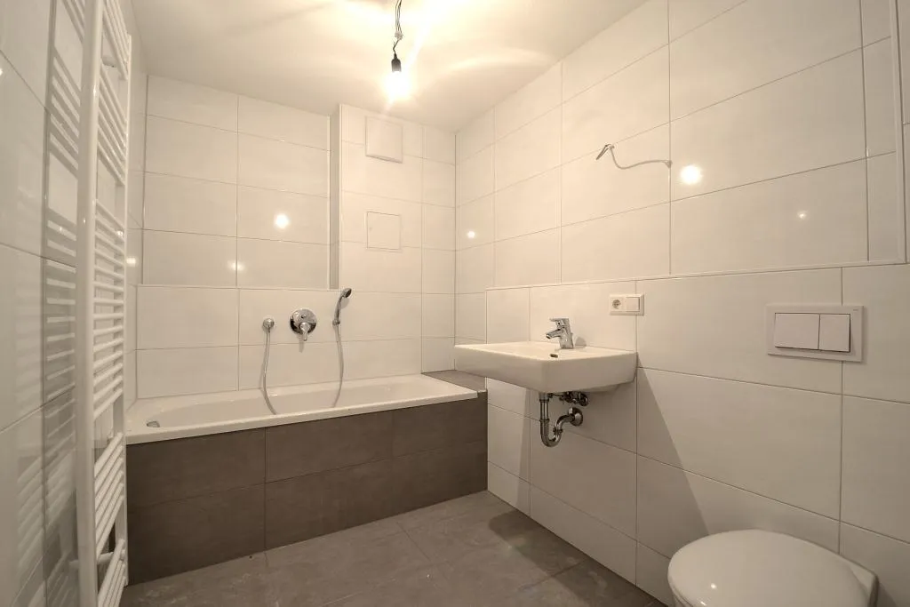 Das Badezimmer wird raumhoch weiß gefliest und mit einer Wanne sowie einem WC ausgestattet.