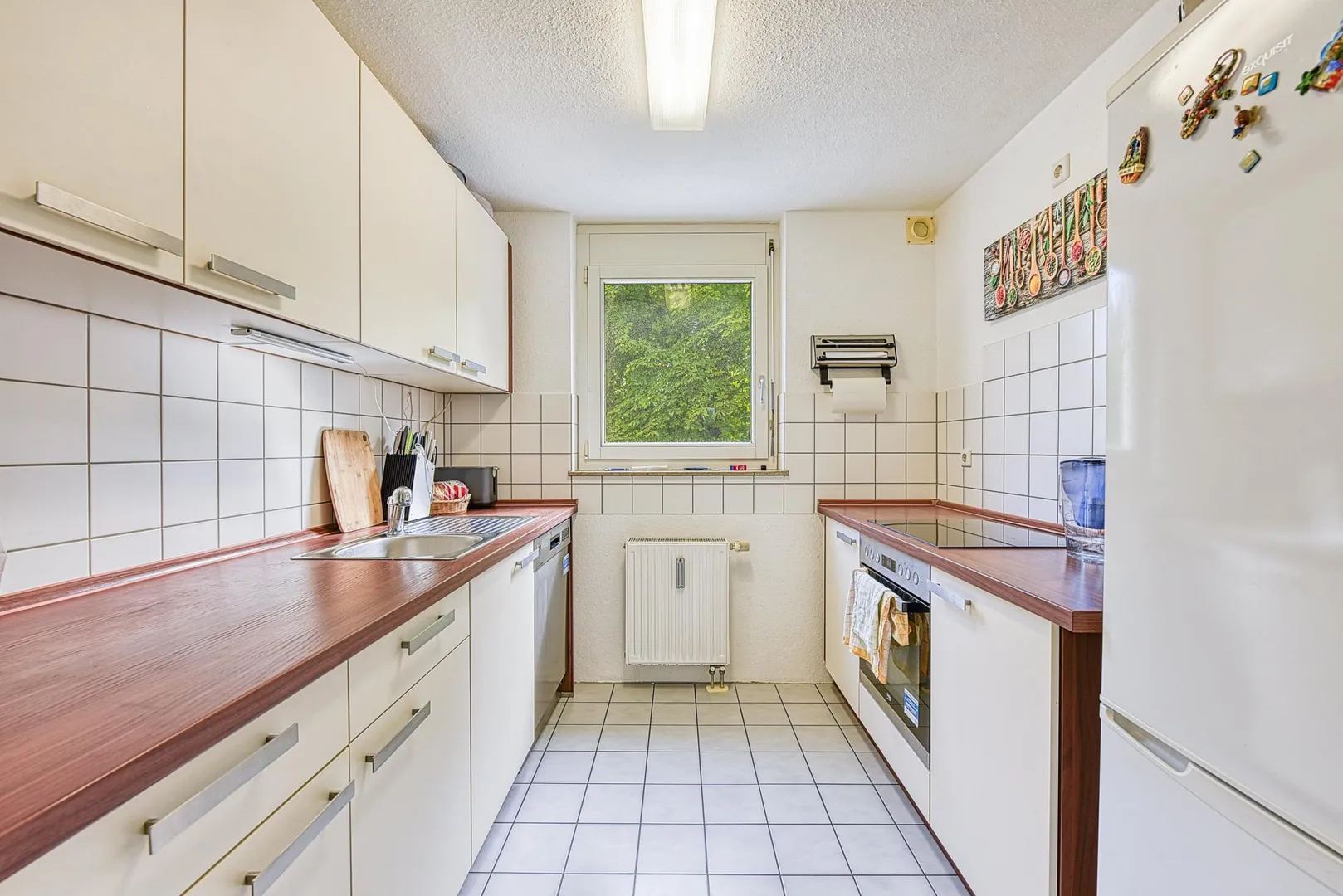 Die Küche ist ausgestattet mit einem Außenabzug. Die Einbauküche der aktuellen Mietern wurde 2017 neu eingebaut und kann für 2.000 EUR (VB) übernommen werden.