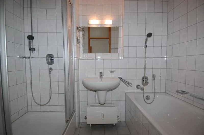 Das raumhoch geflieste Badezimmer ist ausgestattet mit einer Badewanne, einer Dusche sowie einem Waschmaschinenanschluss.