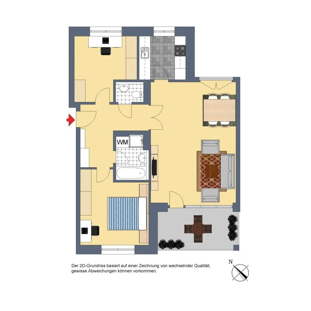 Der Grundriss ist gut. Alle Zimmer sind direkt vom Flur begehbar. Die Küche und der Balkon sind vom Wohnzimmer begehbar. Das WC ist separat. Das Badezimmer sowie das WC sind innenliegend.
