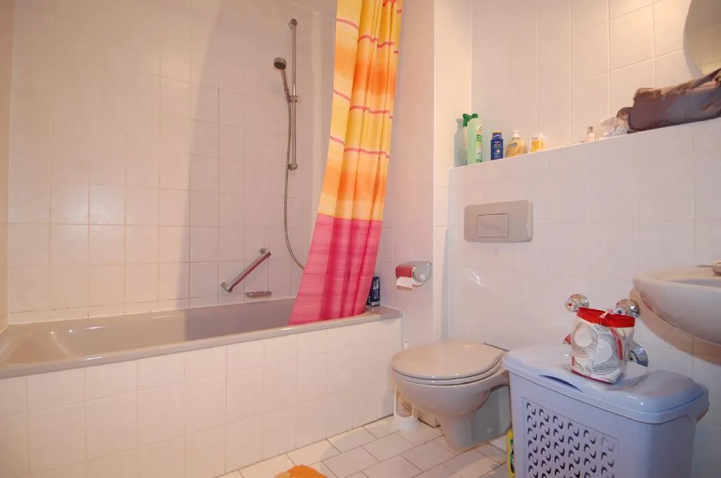 Das Badezimmer ist raumhoch gefliest und verfügt über einen Wanne, einen Waschbecken, ein WC und einen Fliesenboden.