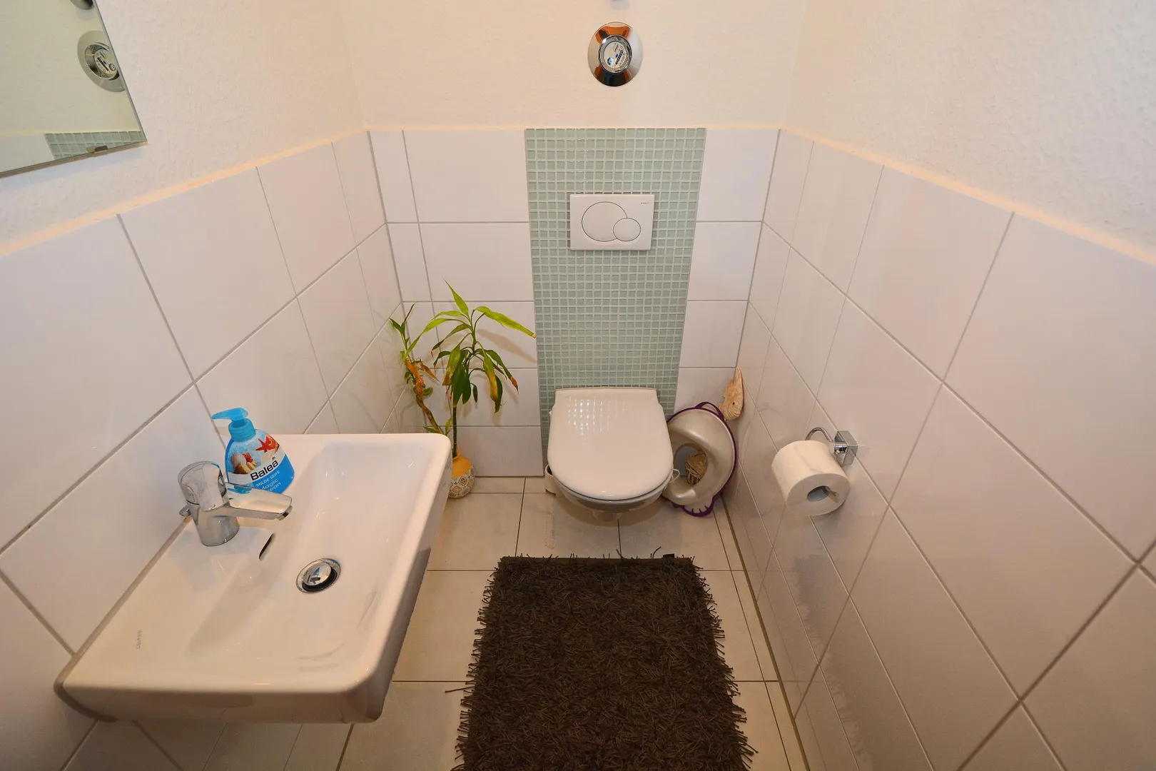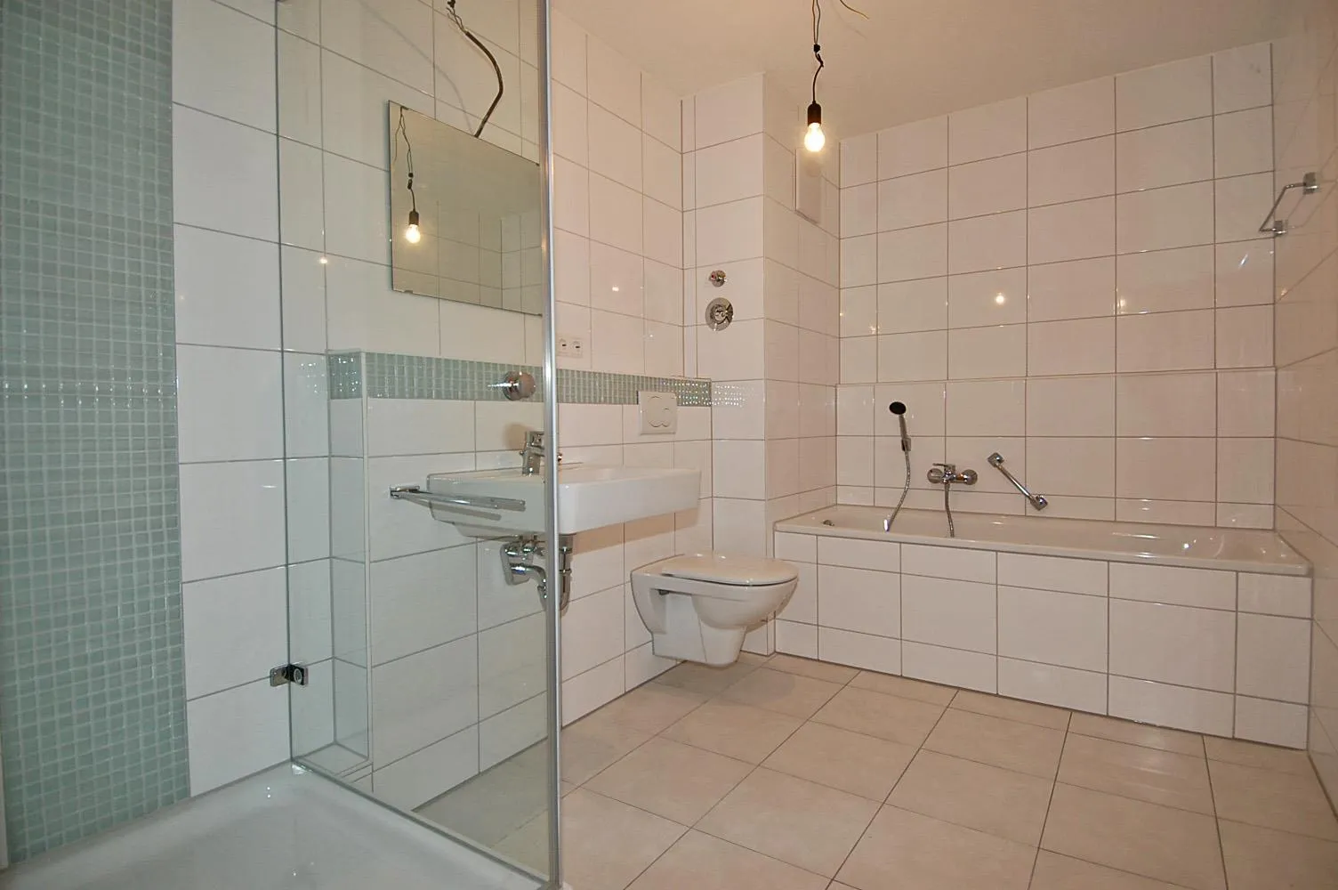 Das Badezimmer ist raumhoch in weiß gefliest und mit einer Badewanne, einer Dusche, einem Waschbecken, einem WC sowie einem Handtuch-Heizkörper ausgestattet.