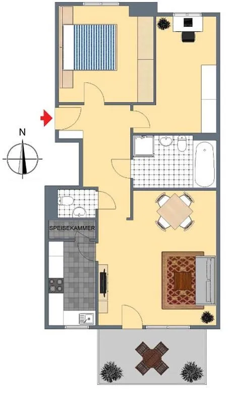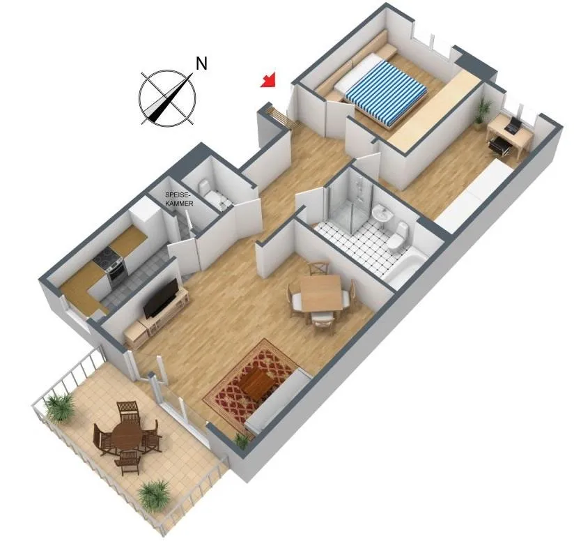 Das Wohnzimmer sowie die Küche sind nach Süden ausgerichtet. Das Schlafzimmer sowie das Kinderzimmer sind nach Norden ausgerichtet.