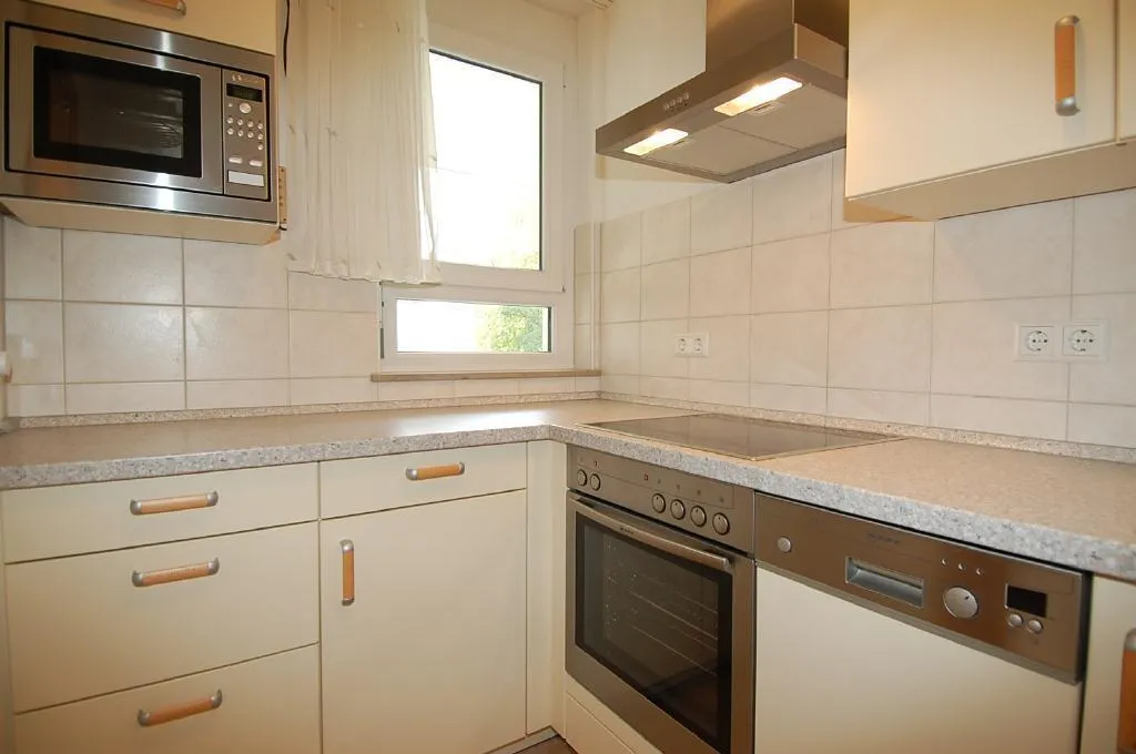 Die Küche ist mit einer Einbauküche ohne Kühlschrank ausgestattet.