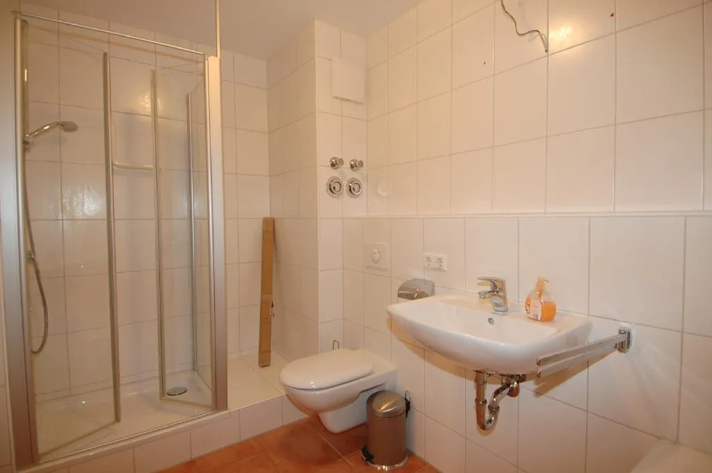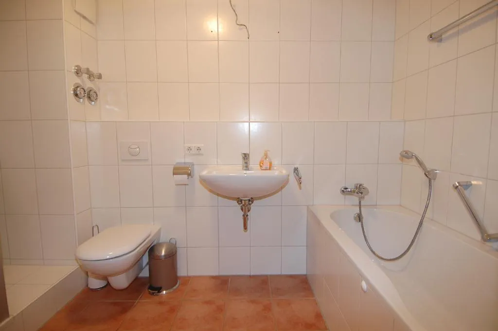 Das Badezimmer ist raumhoch gefliest und ist ausgestattet mit einer Wanne, einer Dusche und einem WC.