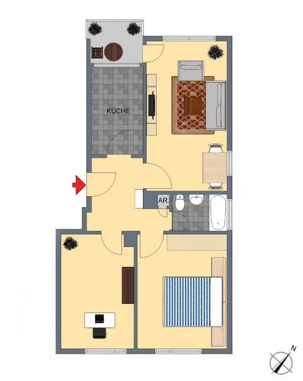 Der Grundriss der Wohnung ist sehr gut. Alle Räume sind vom Flur begehbar. Das Badezimmer verfügt über ein Fenster und die Wohnung über einen Balkon, welcher über das Wohnzimmer begehbar ist.
