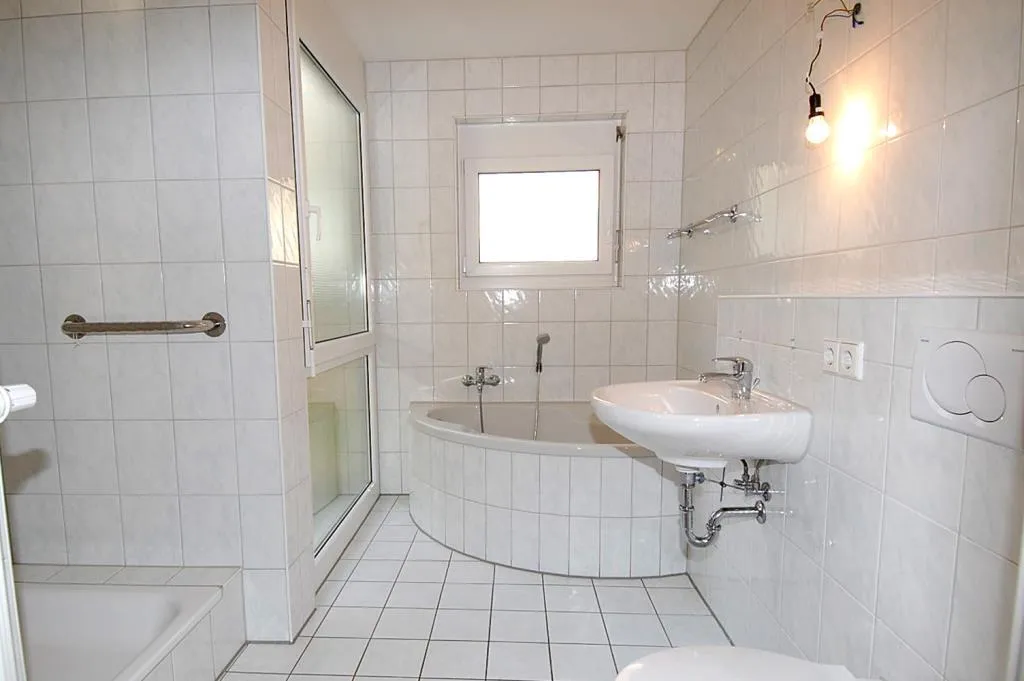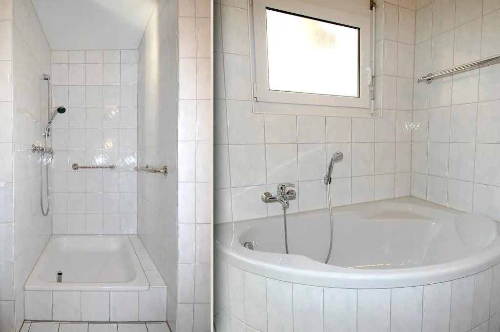 Das raumhoch geflieste Badezimmer mit Fenster verfügt über eine Eckbadewanne, eine Dusche sowie ein WC. Ein zweites, gefliestes WC ist separat.