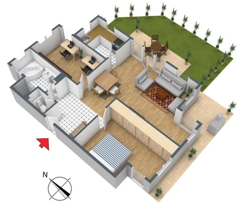 Diese neuwertige und gehoben ausgestattete 3-Zimmer-Terrassen-Wohnung mit Garten befindet sich im Hochparterre (Erdgeschoss).