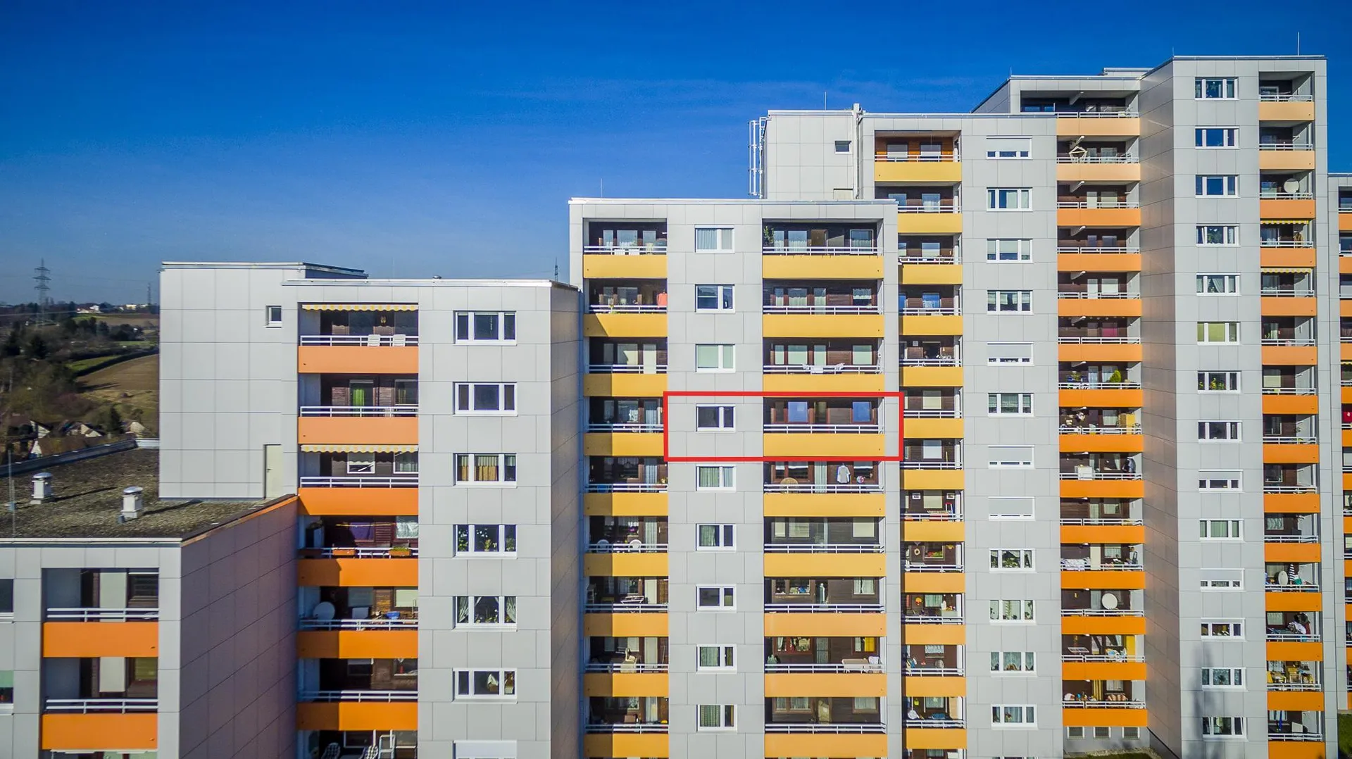 Diese neuwertige und gehoben ausgestattete 2-Zimmer-Wohnung mit Balkon und Fernblick befindet sich im 7. Obergeschoss eines Reihen-Mittel-Hochhauses mit 35 Wohneinheiten.
