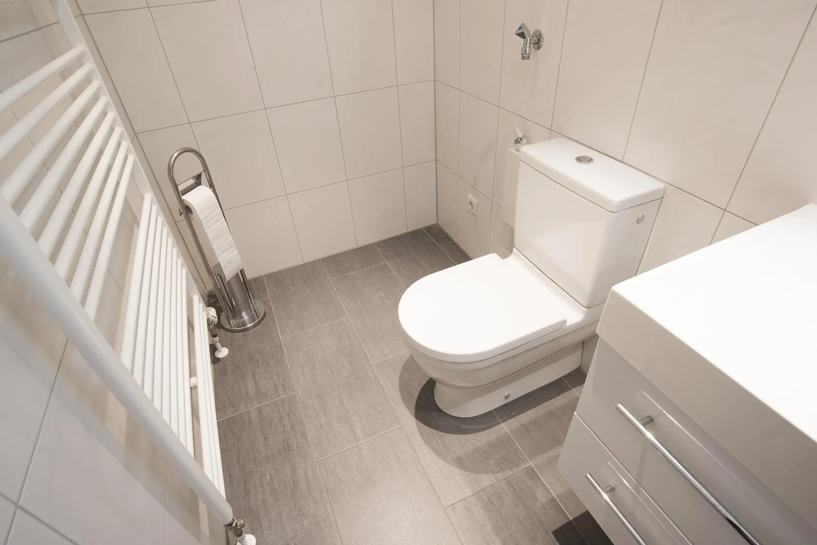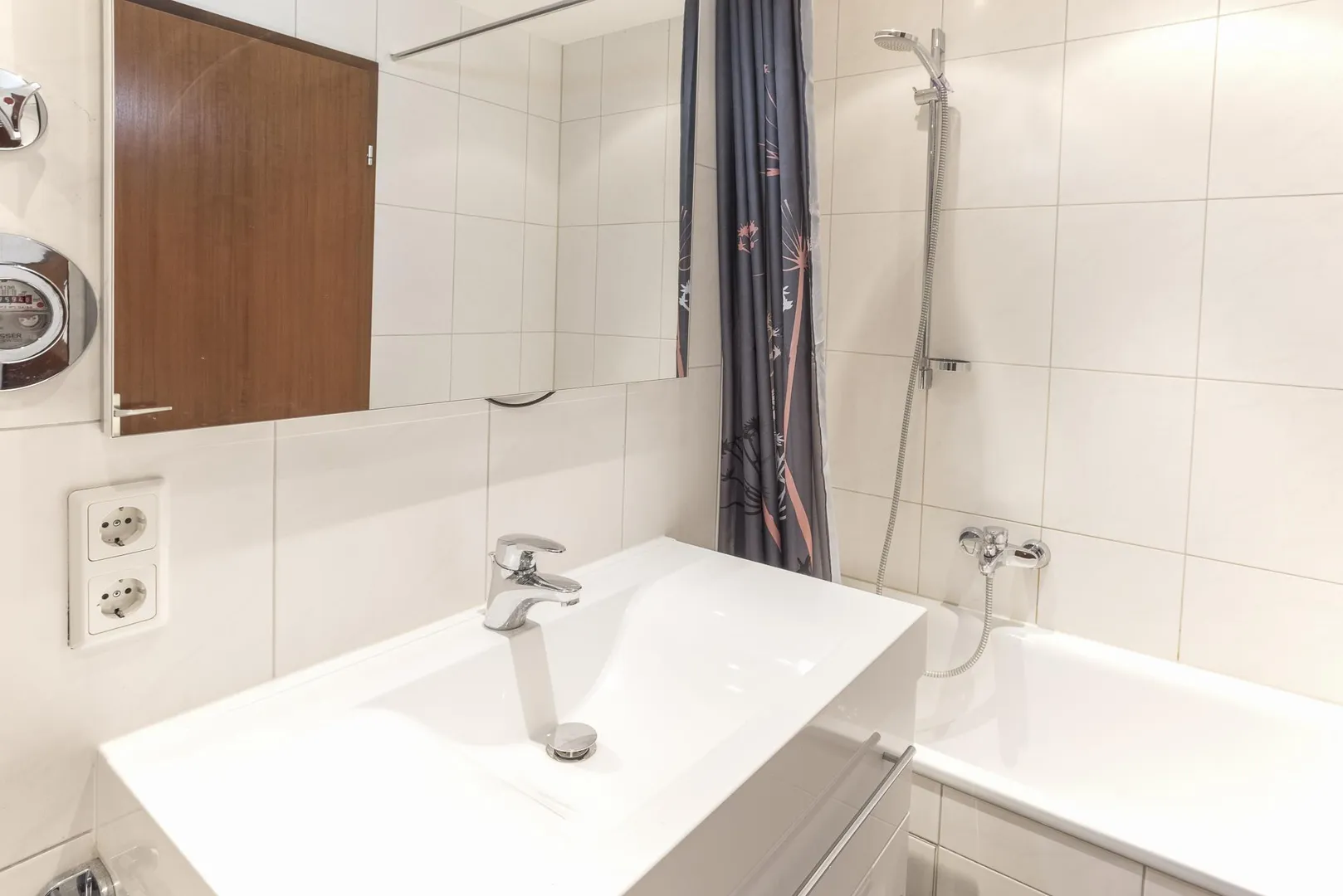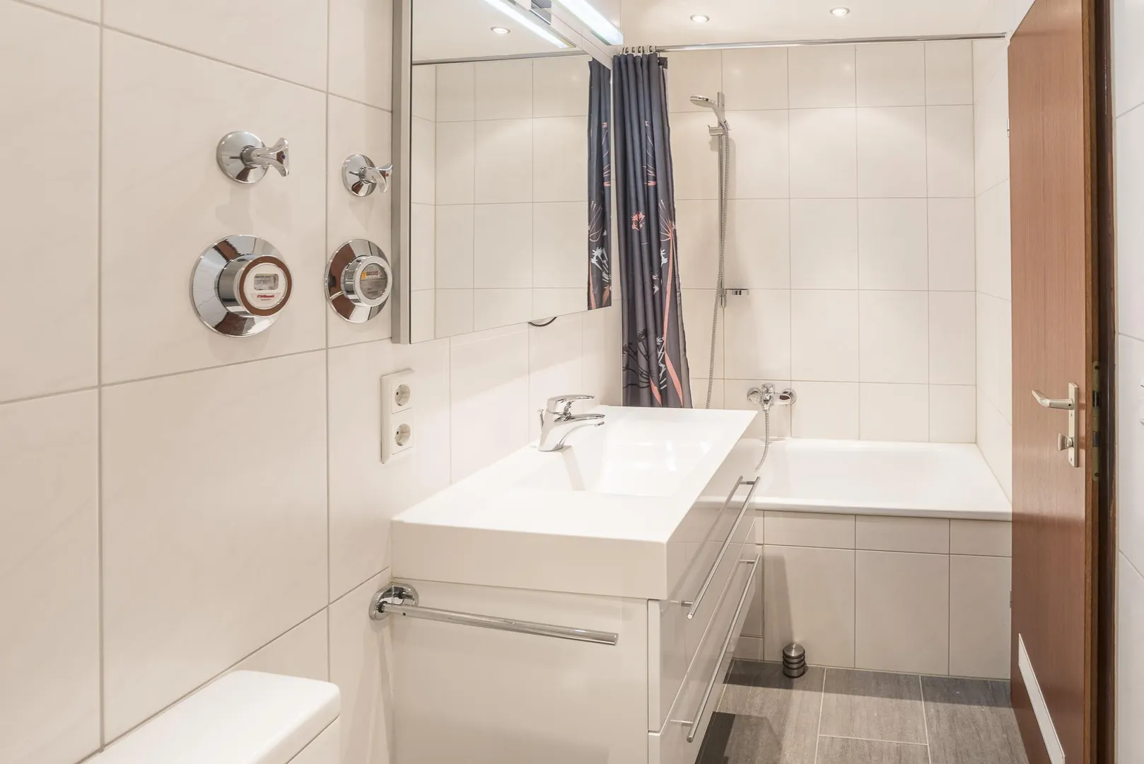 Im raumhoch gefliesten Badezimmer ist die Decke mit Halogenlampen ausgestattet. Das Bad verfügt über eine Badewanne, einen Fliesenboden, ein WC, einen Handtuchheizkörper, einen Waschmaschinenanschluss, ein Waschbecken mit Unterschrank und einen Spiegel mit Belichtung.