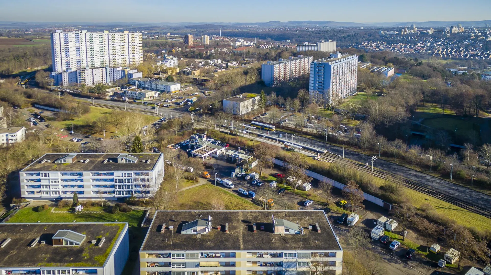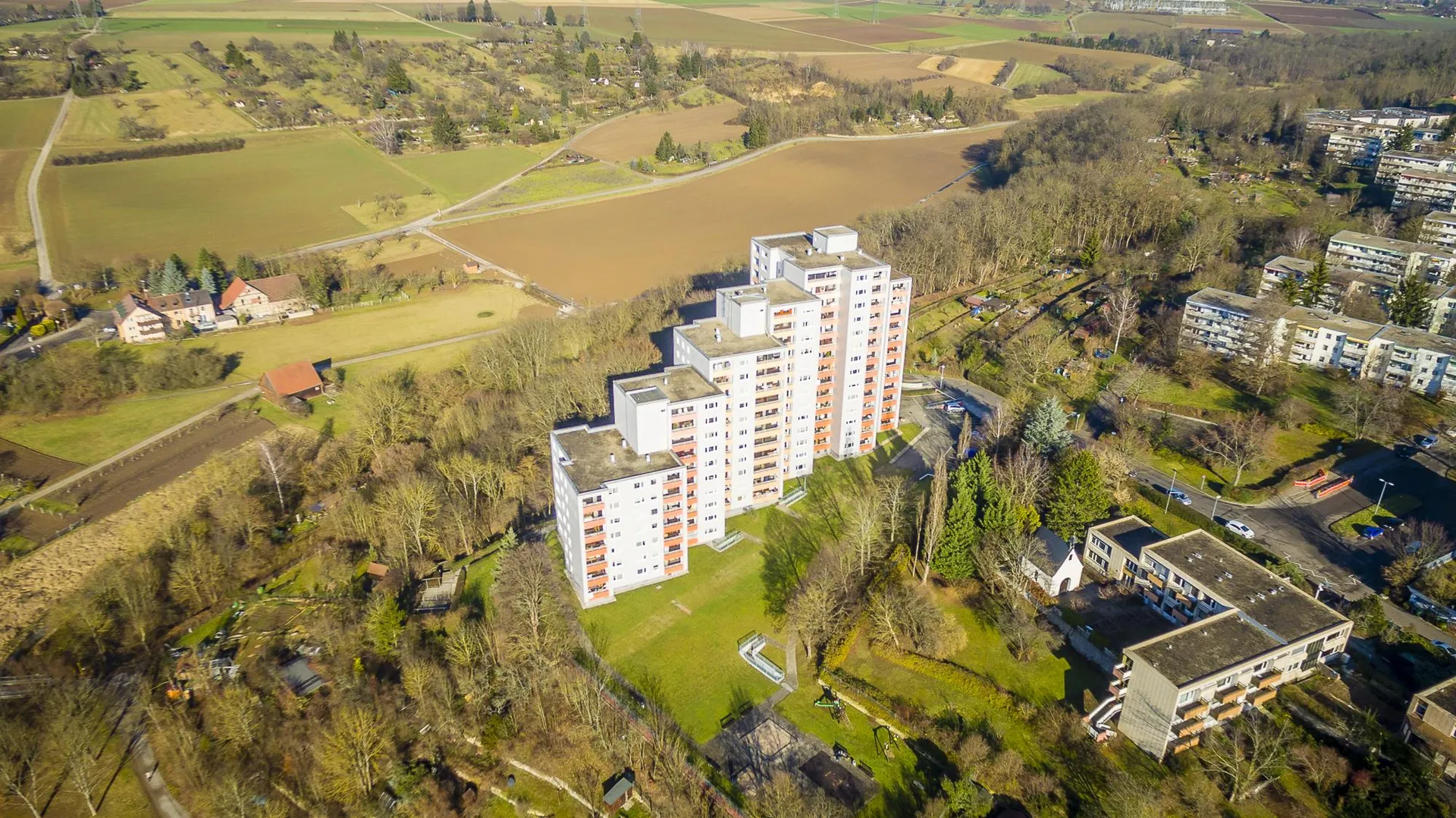 Die Hochhausanlage befindet sich am Ende einer Sackgasse und grenzt direkt an grünes Umfeld mit Schrebergärten, Feldern und Wald.