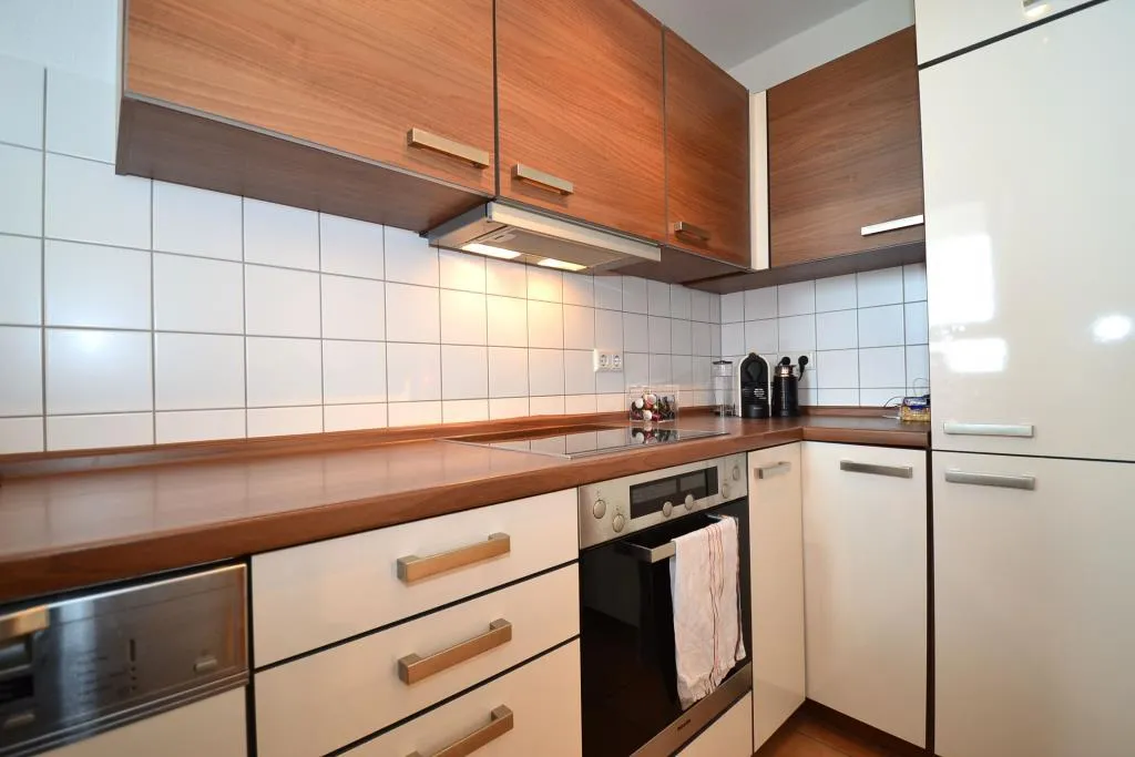 Die Küche ist über das Wohnzimmer begehbar und ist ausgestattet mit einer Einbauküche und einer Schiebetür. Die Einbauküche wurde ca. 2006 eingebaut und verfügt über hochwertige Miele-Elektrogeräte (Herd mit Backofen, Kühlschrank, Gefrierschrank, Spülmaschine, Dunstabzug) sowie Unter- und Oberschränke.