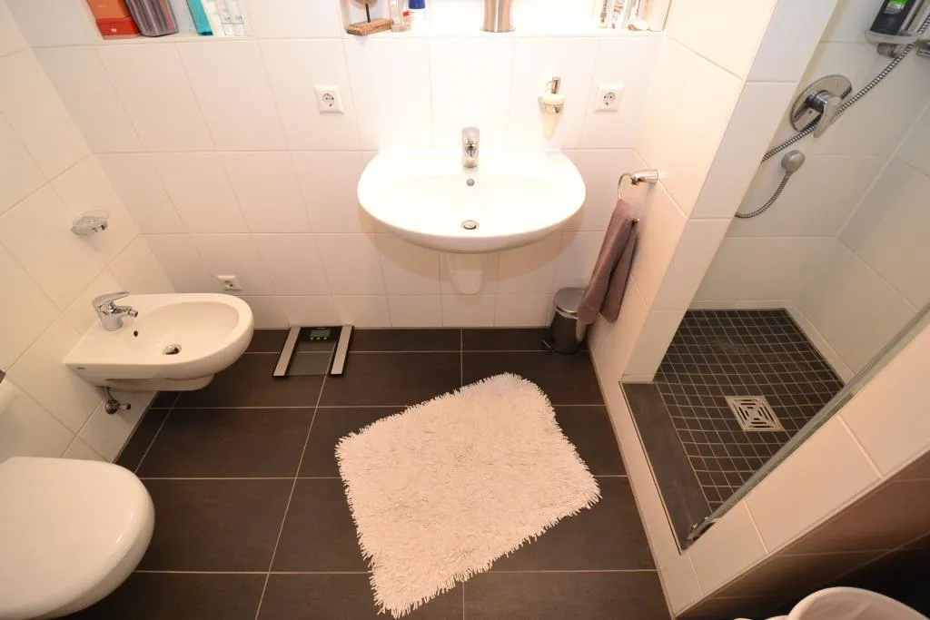 Das raumhoch geflieste Badezimmer ist ausgestattet mit einem Oberlichtfenster, einer Dusche, einem WC, einem Bidet, einem Handtuch-Heizkörper sowie einem Waschmaschinenanschluss.