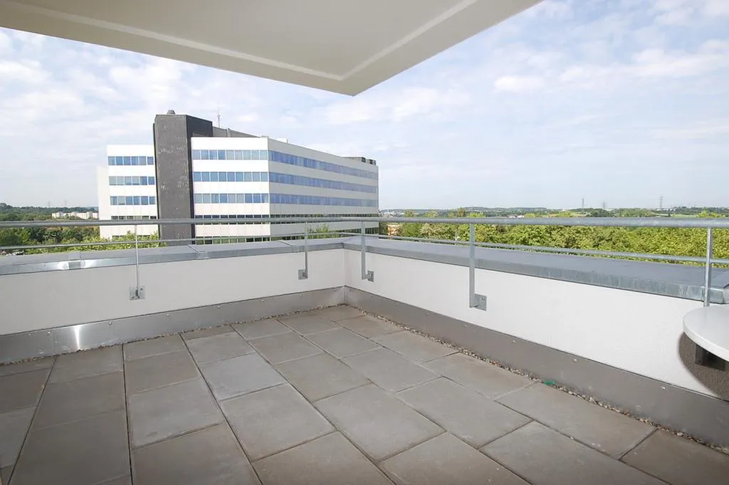 Der komplett überdachte, ca. 10 m² große Balkon ist nach Süden und Westen ausgerichtet und ist vom Wohnzimmer begehbar.