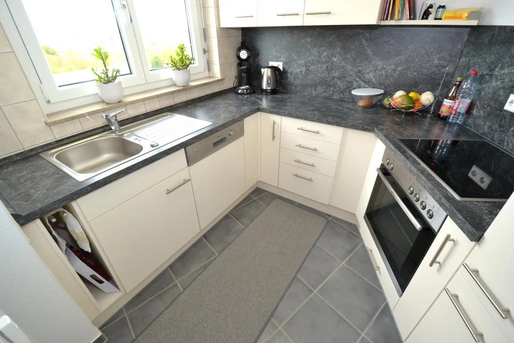 Die Küche ist mit einer neuen Einbauküche ausgestattet und ist über das Wohnzimmer begehbar. Die Einbauküche ist ausgestattet mit einem Kühlschrank mit Gefrierfach, einer Spülmaschine, einem Herd mit Backofen, einer Dunstabzugshaube mit Abzug nach außen, Ober- sowie Unterschränken.