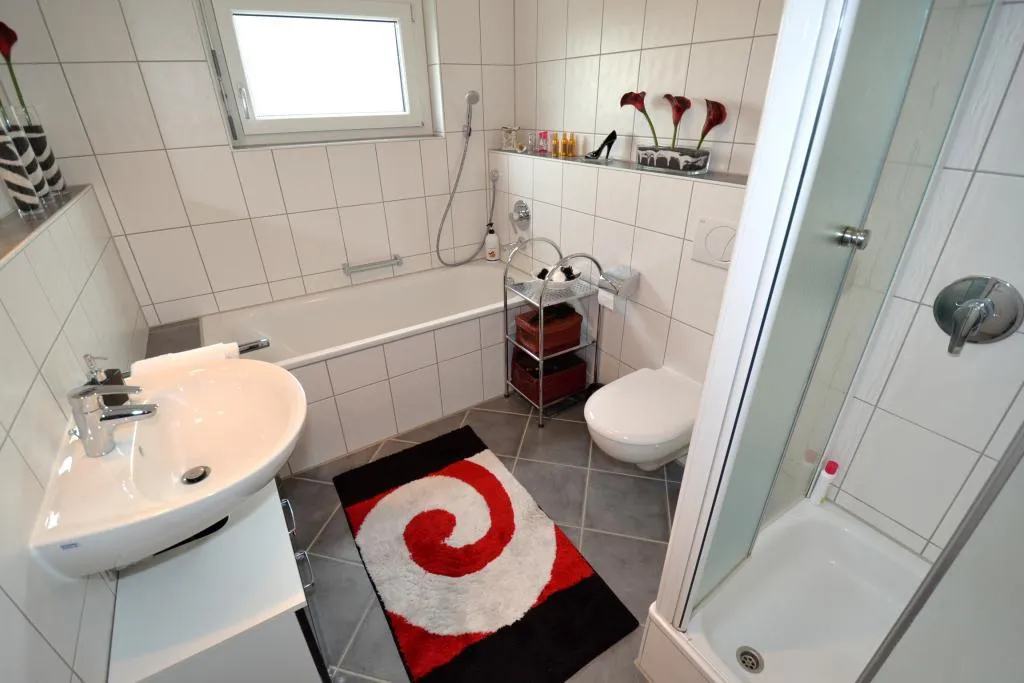 Das raumhoch geflieste Tageslicht-Badezimmer ist ausgestattet mit einer Wanne, einer Dusche und einem WC.