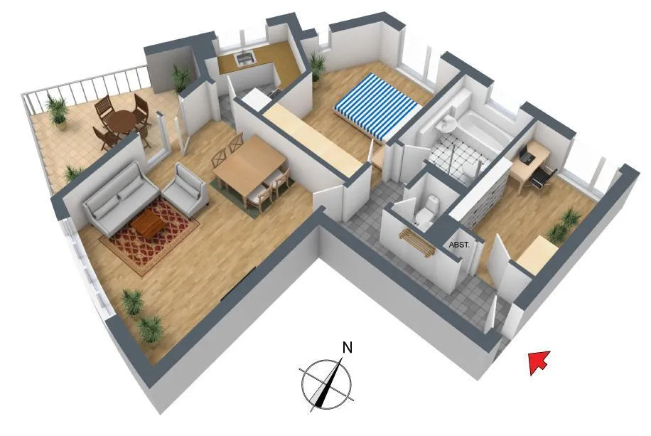 Das Wohnzimmer ist nach Süden und Westen ausgerichtet. Die beiden anderen Zimmer sind mit bodentiefen Fenster-Element ausgestattet und sind nach Norden ausgerichtet.