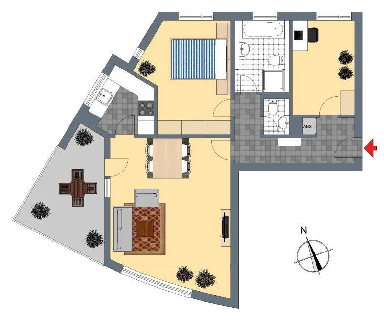 Der Grundriss der Wohnung ist sehr gut. Bis auf die Küche sind alle Räume direkt vom Flur begehbar. Das Badezimmer verfügt über ein Fenster. Ein zweites WC ist separat.