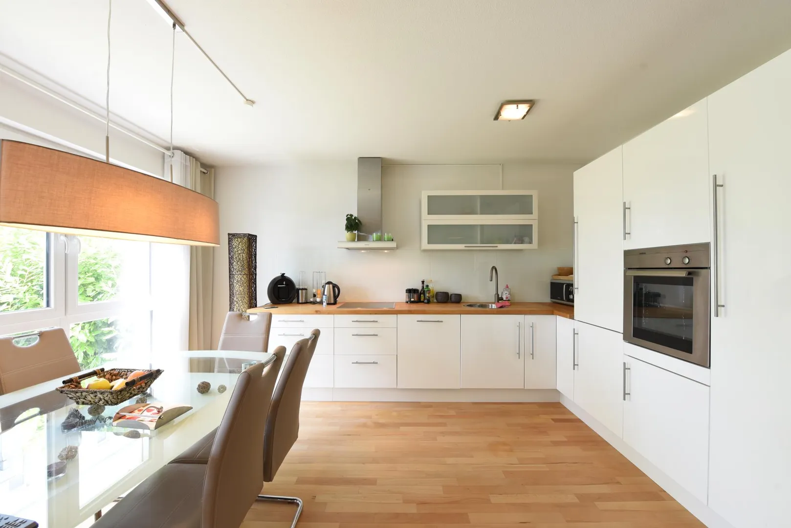Die offene Küche ist mit einer Einbauküche ausgestattet. Ein Abzug nach außen ist möglich. Die neuwertige Einbauküche verfügt über weiße Hochglanzfronten, einen Herd, einen Backofen, eine Spülmaschine, einen Kühlschrank, einen Gefrierschrank, einen Dunstabzug sowie Ober- und Unterschränke. Für die künftige Funktionsfähigkeit der E-Geräte übernimmt der Vermieter keine Haftung.