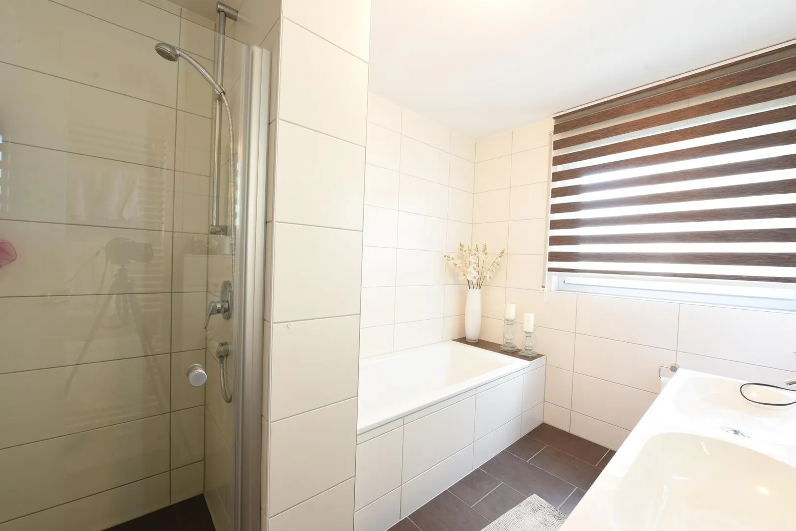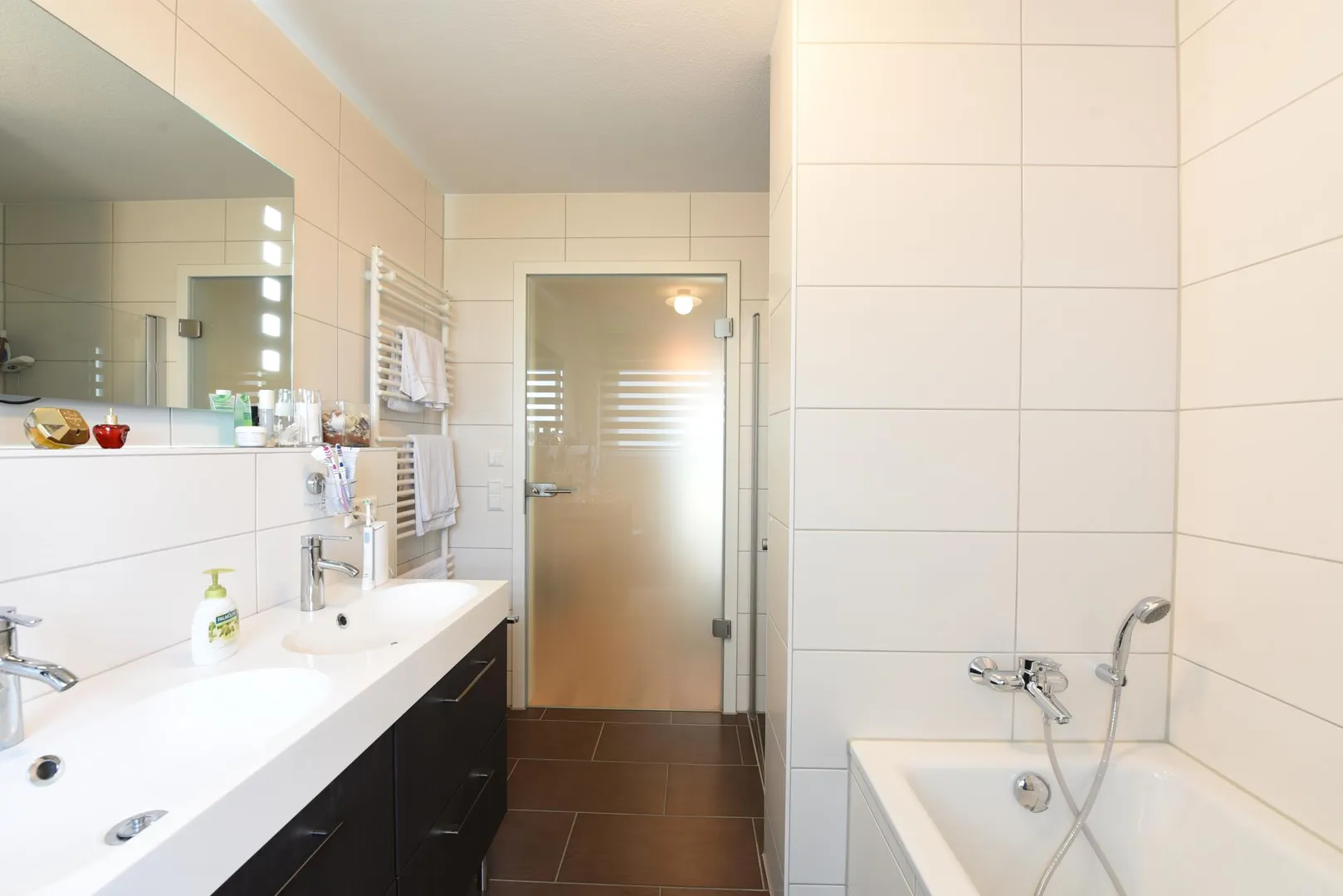 Das raumhoch geflieste Badezimmer mit Fenster ist ausgestattet mit einer Badewanne, einer Dusche, zwei Waschbecken, einem WC, einem Handtuchheizkörper, einem Spiegel mit Beleuchtung sowie einem Waschtisch-Unterschrank.