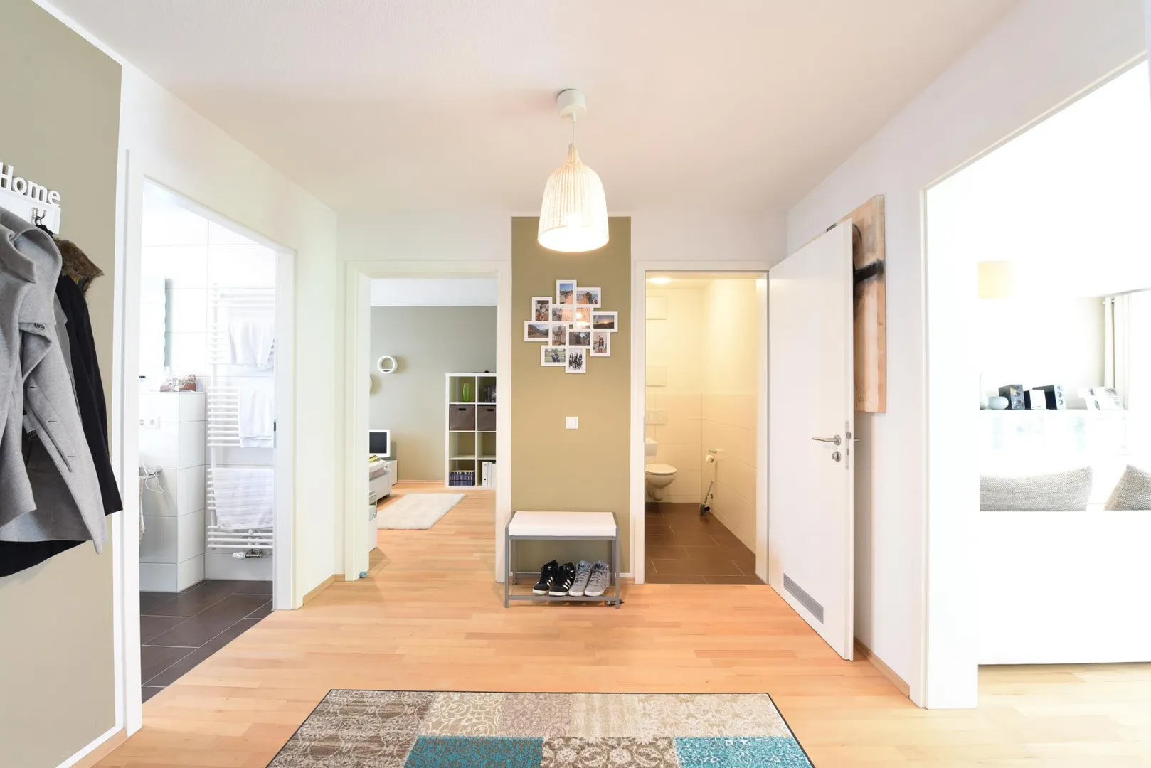 Die Böden im Flur, in den Zimmern sowie in der offenen Küche sind mit Parkettböden ausgestattet. Die Böden im Badezimmer sowie im separaten WC sind gefliest.
