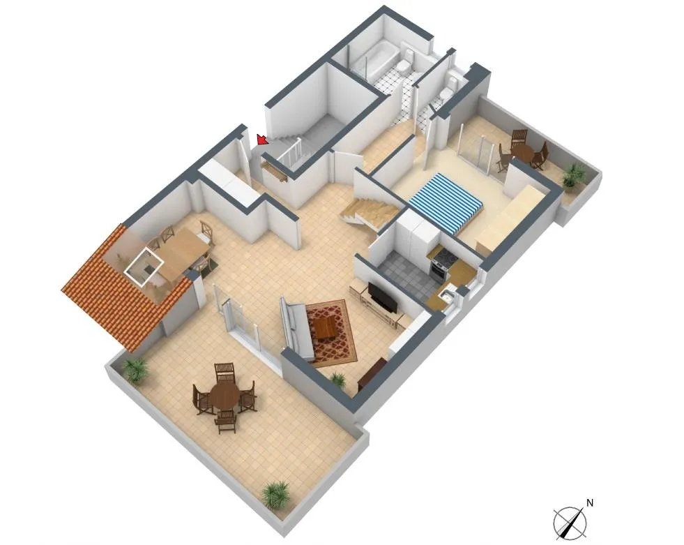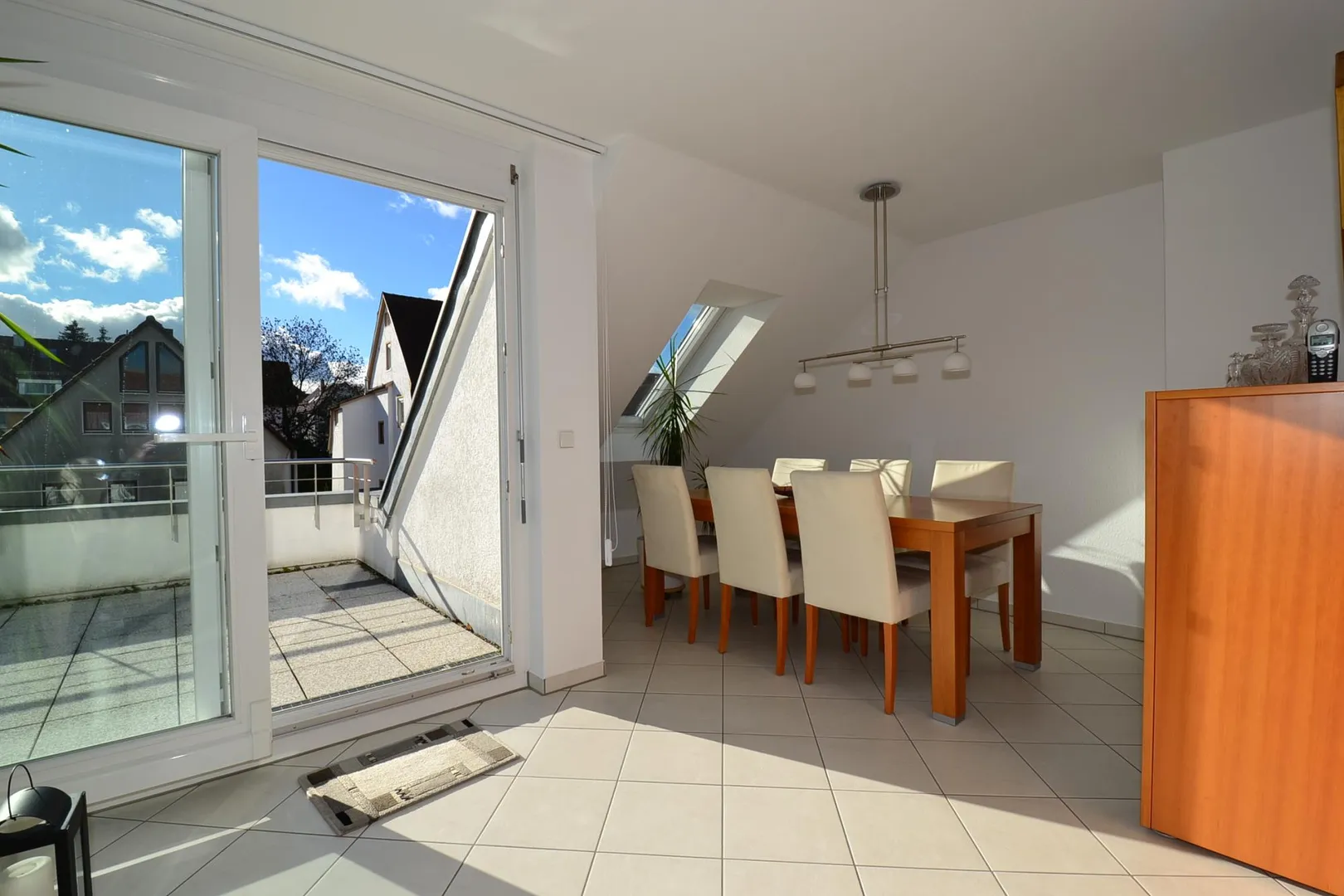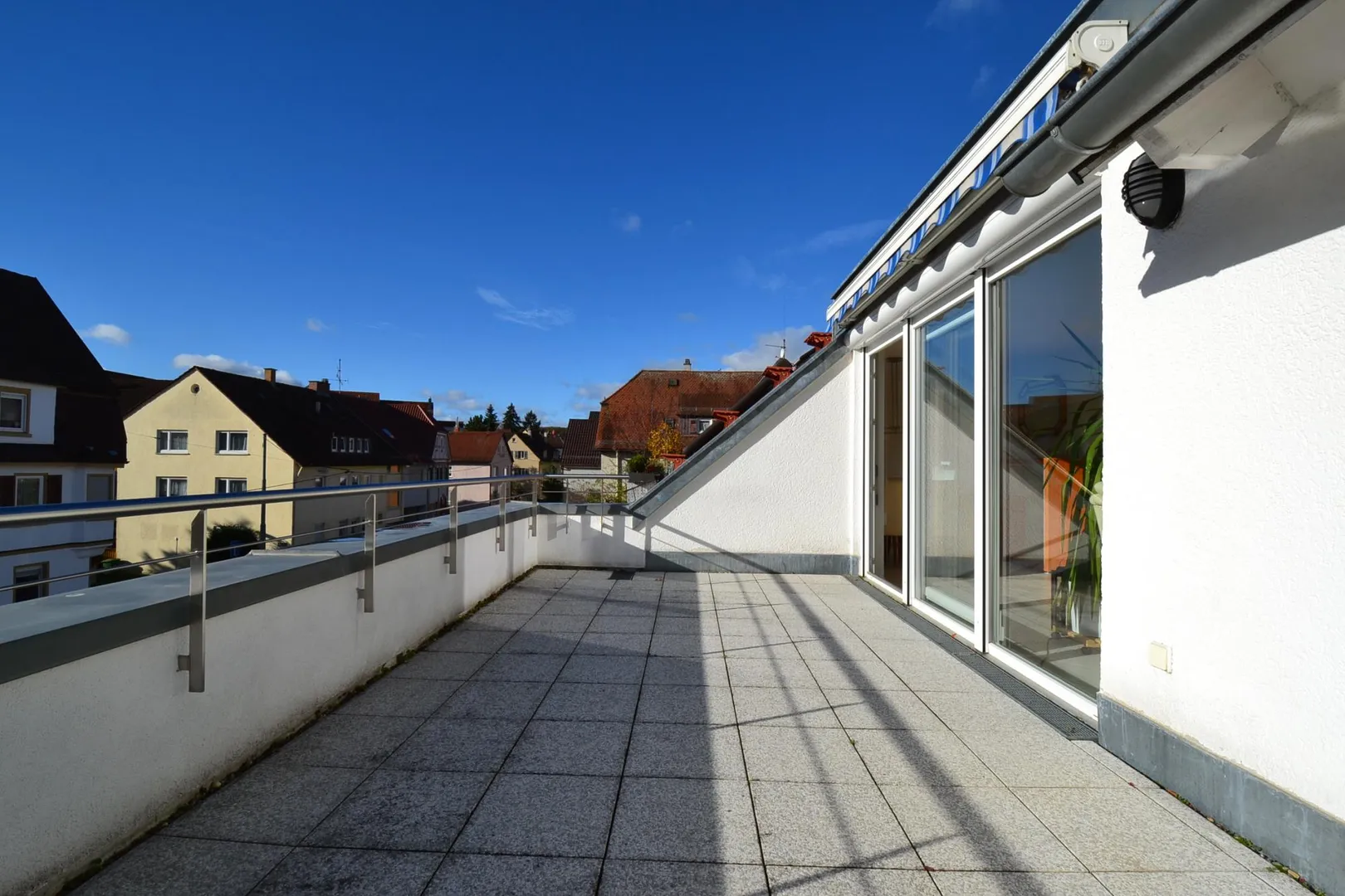 Vom offenen Wohnbereich ist die große Süd-Dach-Terrasse begehbar. Die Terrasse ist mit einer Markise ausgestattet.