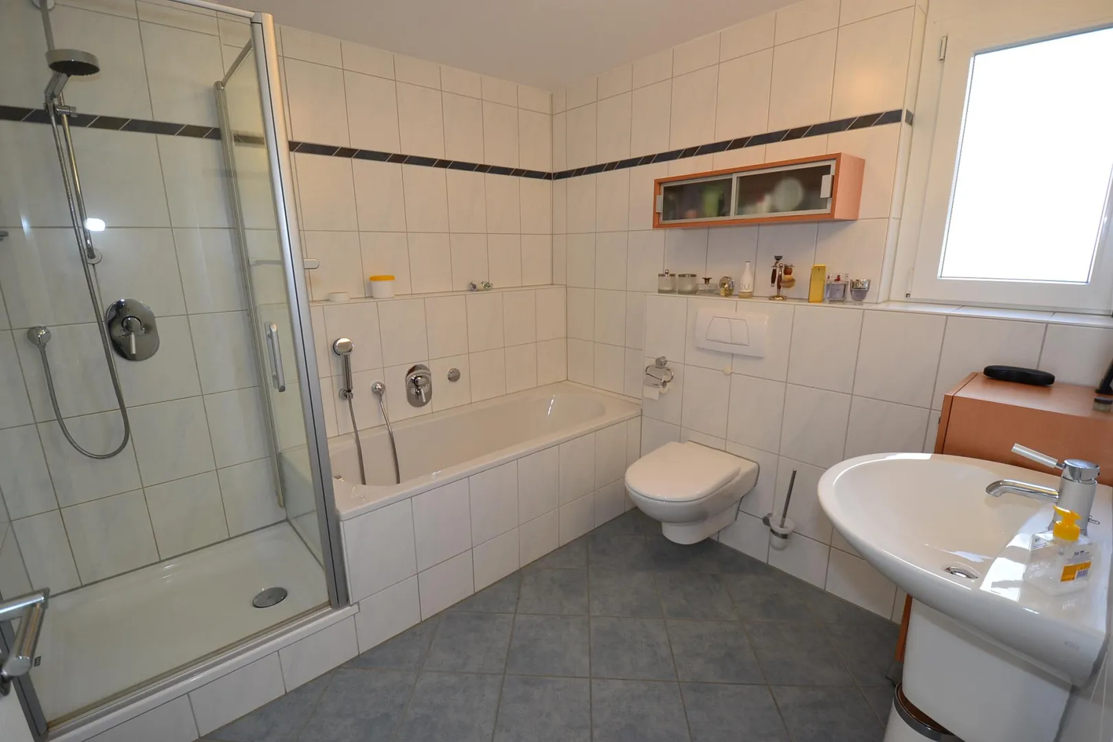 Das raumhoch geflieste Badezimmer mit Fenster ist ausgestattet mit einer Badewanne, einer Dusche, einem WC und einem Handtuchheizkörper.