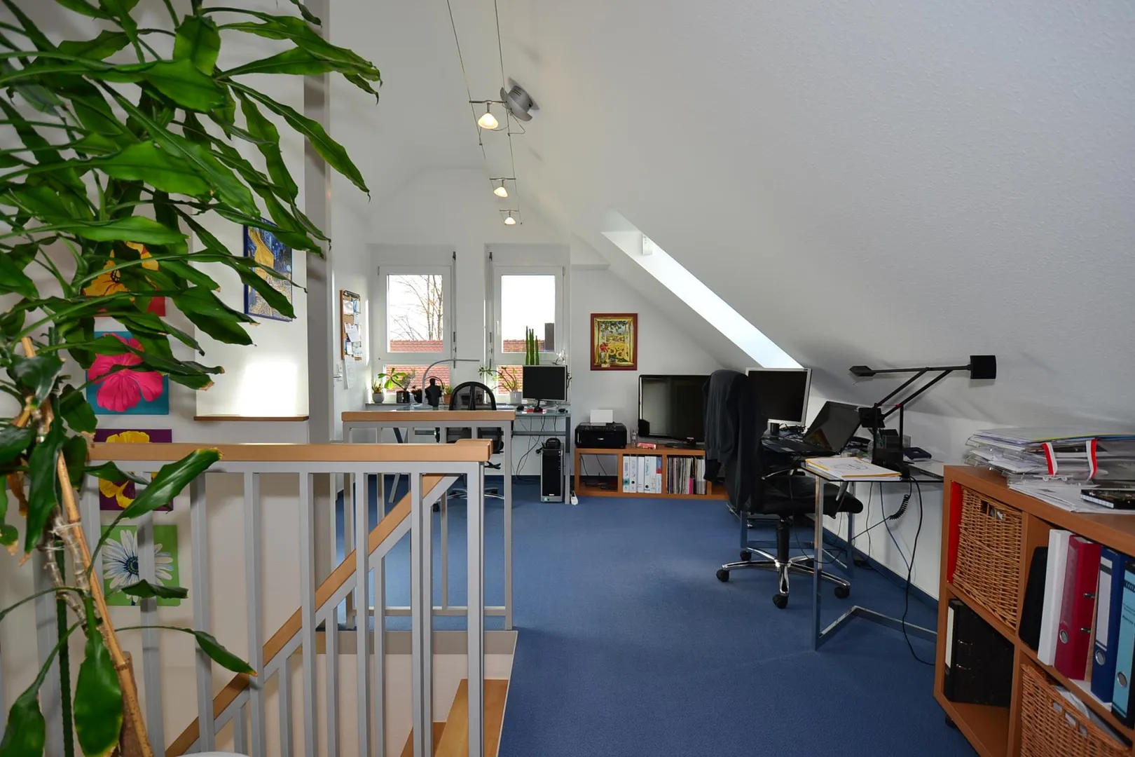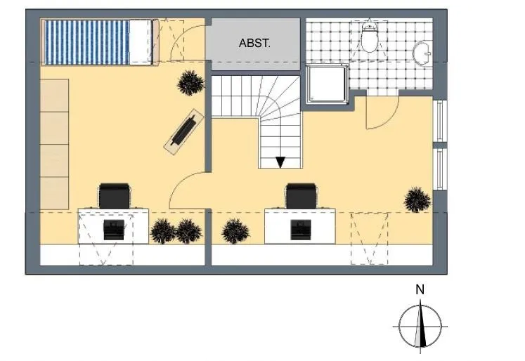 Im Dachgeschoss 2 befinden sich ein offener Raum (Dach-Studio), ein Dach-Zimmer, ein Abstellraum sowie ein Badezimmer.