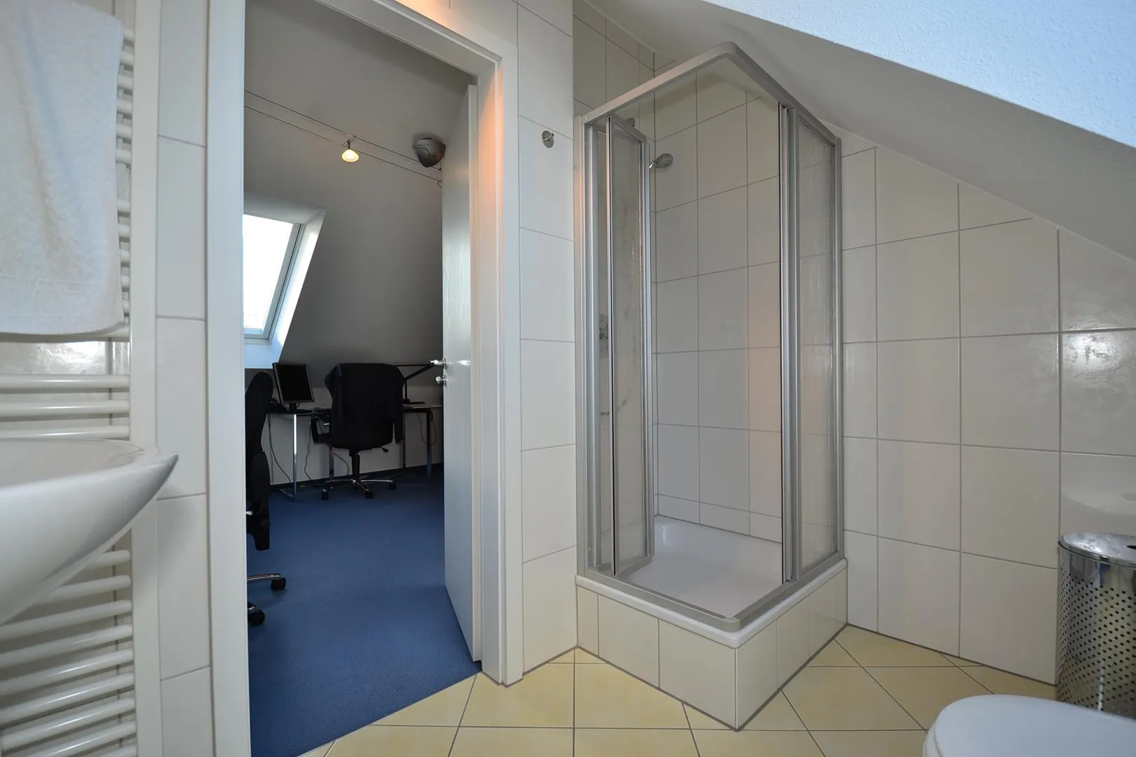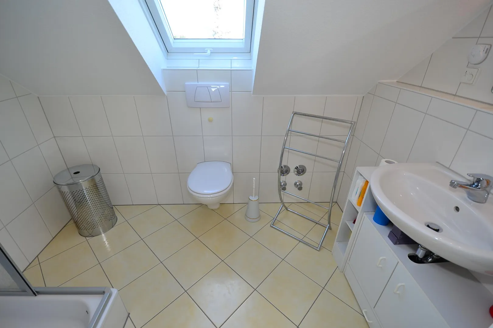 Im Dachgeschoss 2 wurde Teppichboden verlegt. Der Boden im Badezimmer ist gefliest. Das Badezimmer mit Fenster ist raumhoch gefliest und mit einer Dusche, einem WC und einem Handtuchheizkörper ausgestattet.