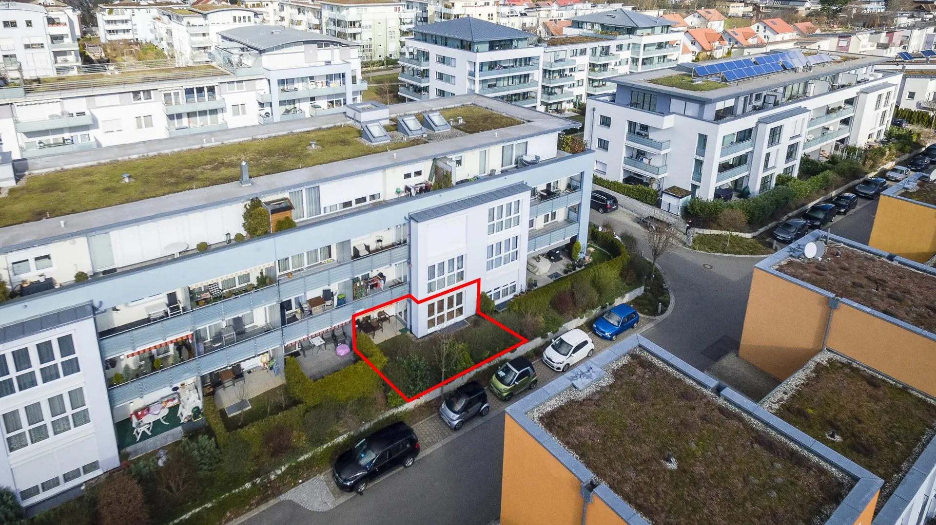 Die ca. 7,8 m² große und überdachte Terrasse ist nach Süden ausgerichtet und ist sowohl über das Wohnzimmer, als auch über das Schlafzimmer begehbar.