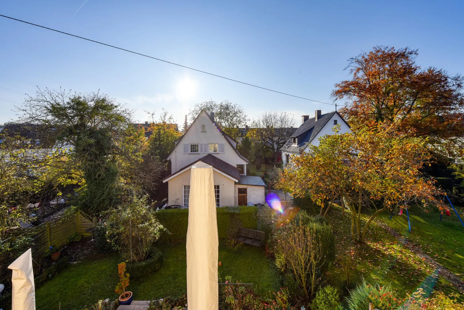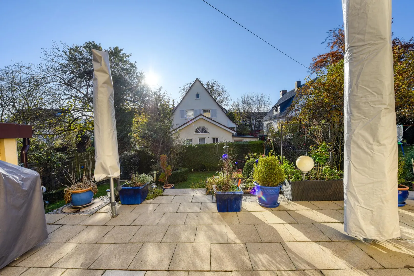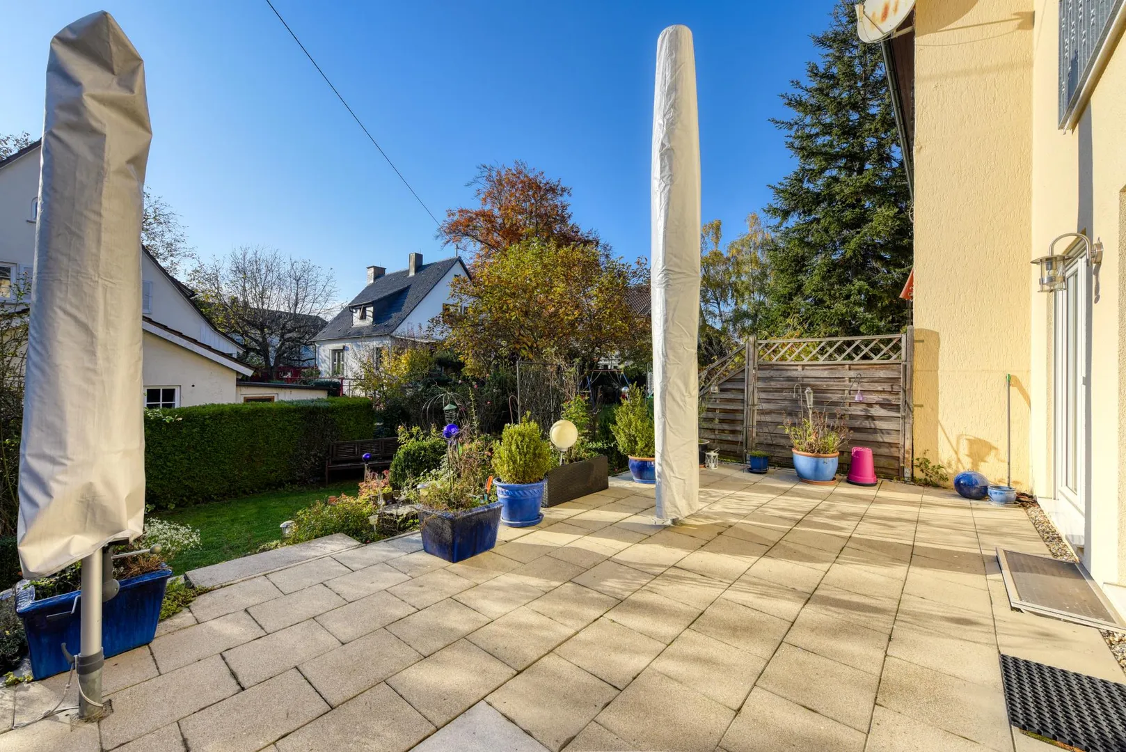 Auf der Süd/West-Hausseite befinden sich eine ca. 30 m² große Terrasse mit zwei integrierten Sonnenschirmen und ein ca. 90 m² großer Garten. Der ebene Garten ist über 6 Stufen nach unten von der Terrasse begehbar.