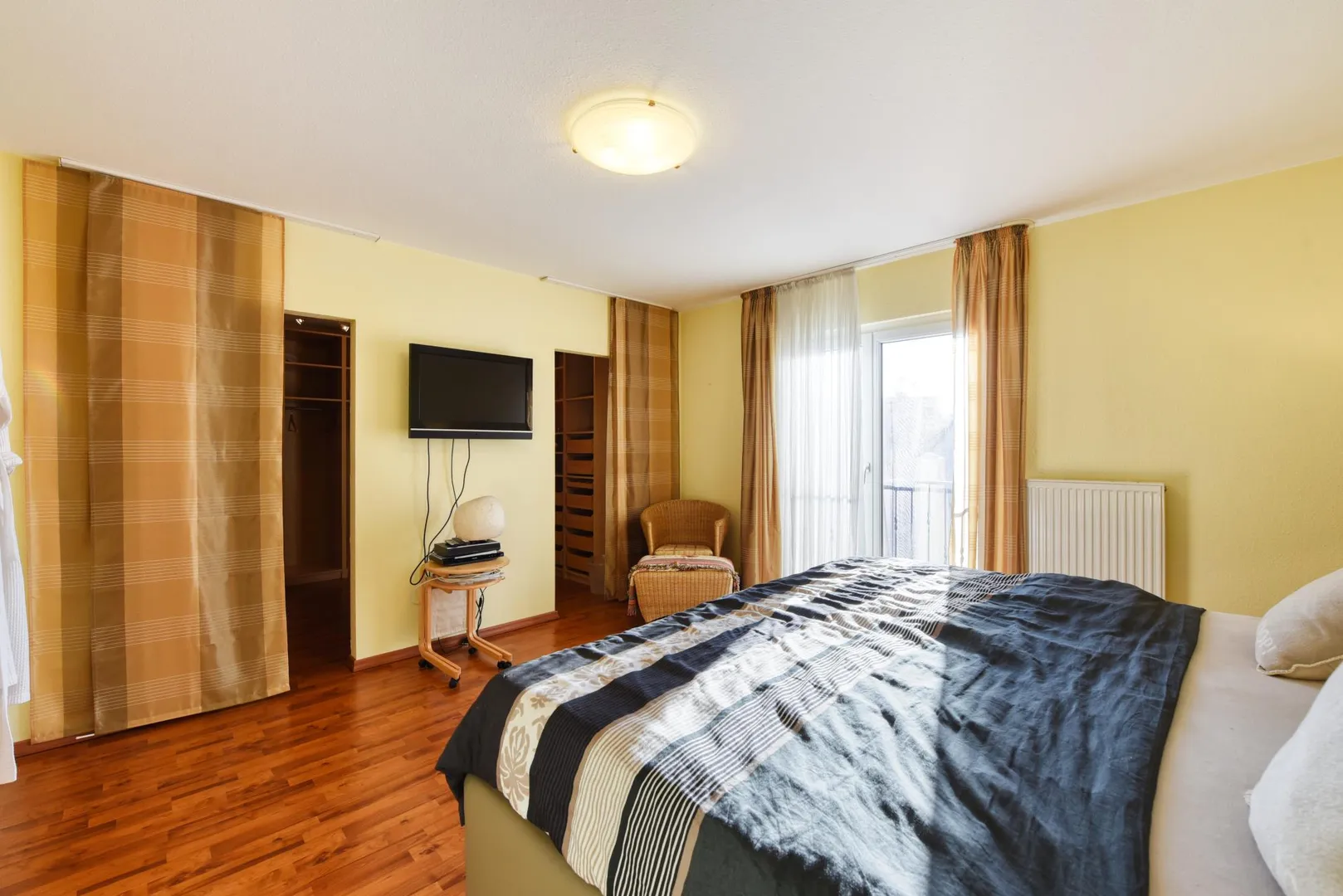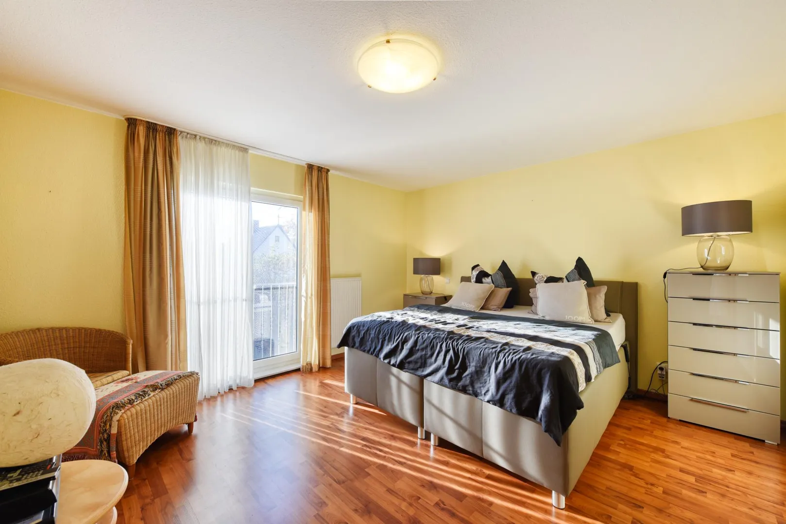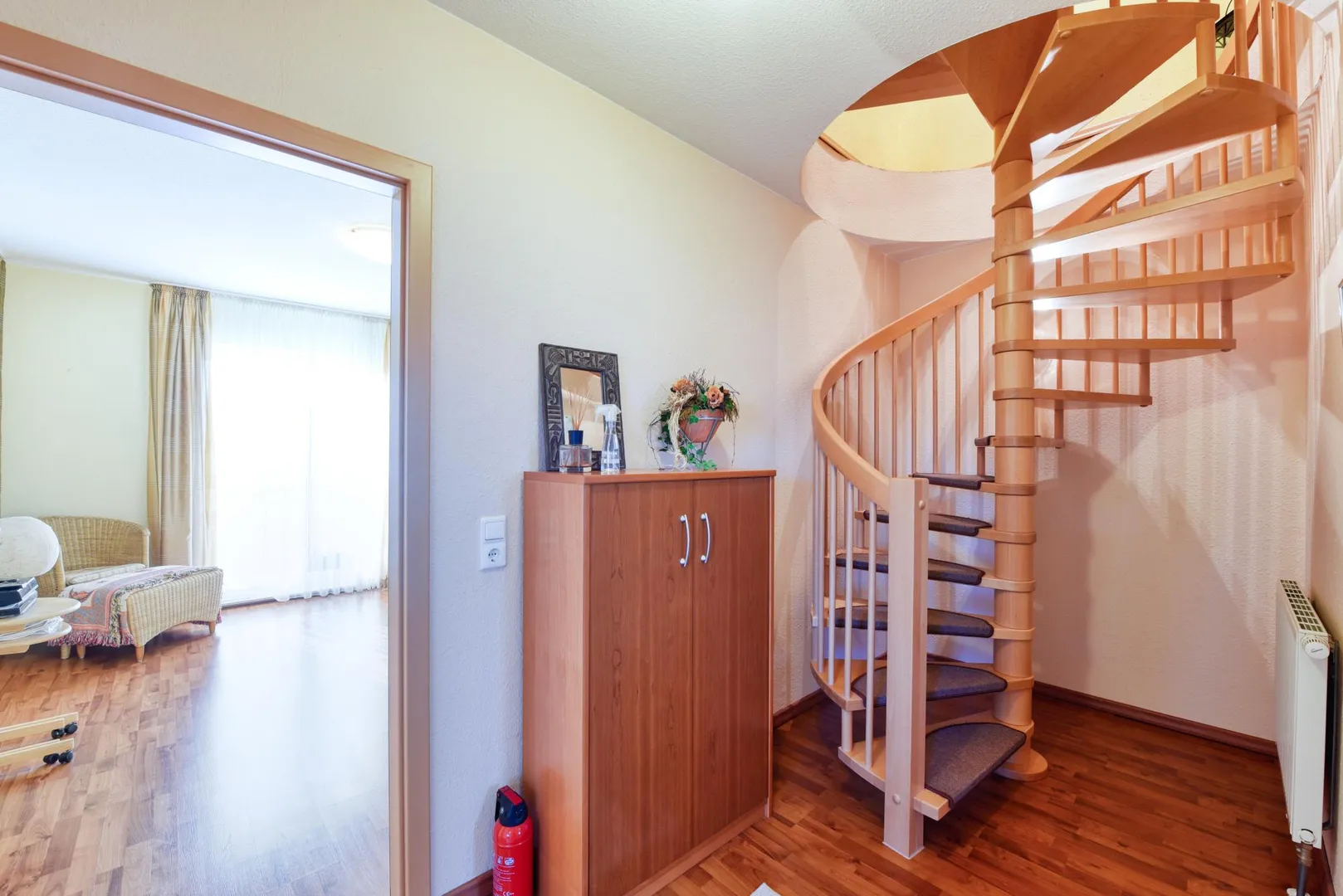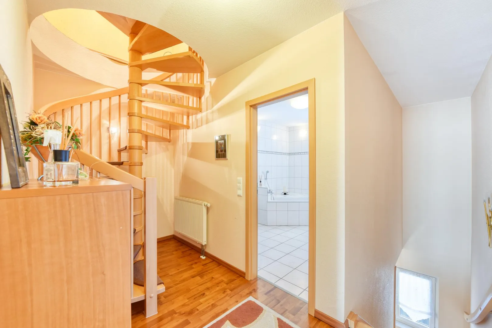 Im Obergeschoss befinden sich ein Kinderzimmer, das Schlafzimmer mit französischem Balkon in Süd/West-Ausrichtung sowie einem begehbaren, ca. 12 m² großen Kleiderschrank sowie das Haupt-Badezimmer mit Dusche/Wanne/WC/Handtuch-Heizkörper/Fenster/Fliesenboden. Die Böden im Flur und in den Zimmern sind mit Laminat ausgestattet. Die Wände sind mit Raufasertapeten tapeziert. Die Raumhöhe beträgt ca. 2,50 Meter. Über eine Wendel-Treppe im Flur ist das Dachgeschoss begehbar.