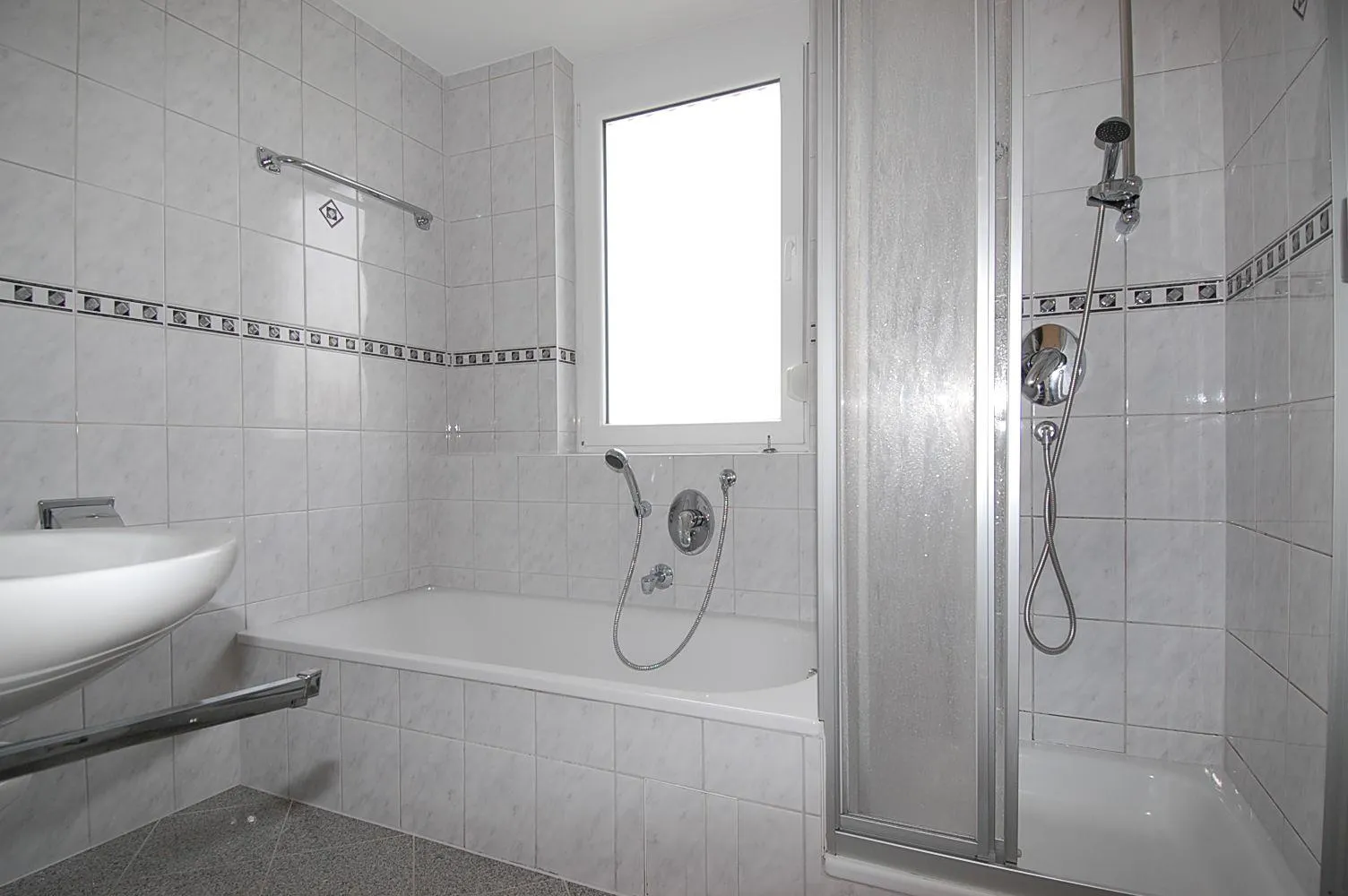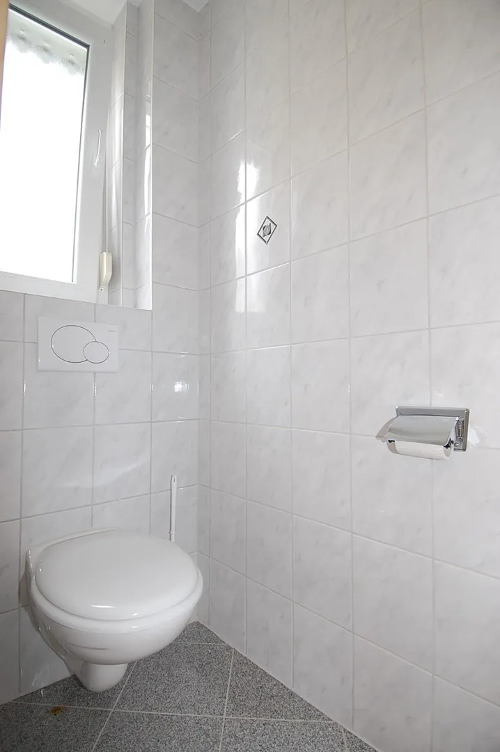 Das Tageslicht-Badezimmer ist mit hellen Granitsteinen gefliest und mit Badewanne, Duschkabine, WC und einem Handtuchheizkörper ausgestattet.