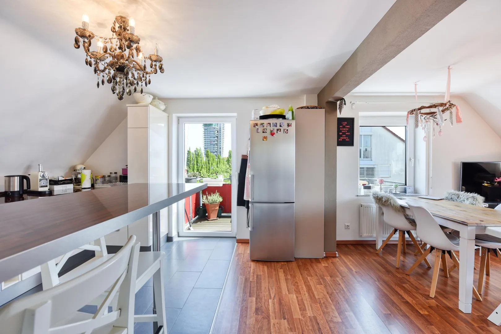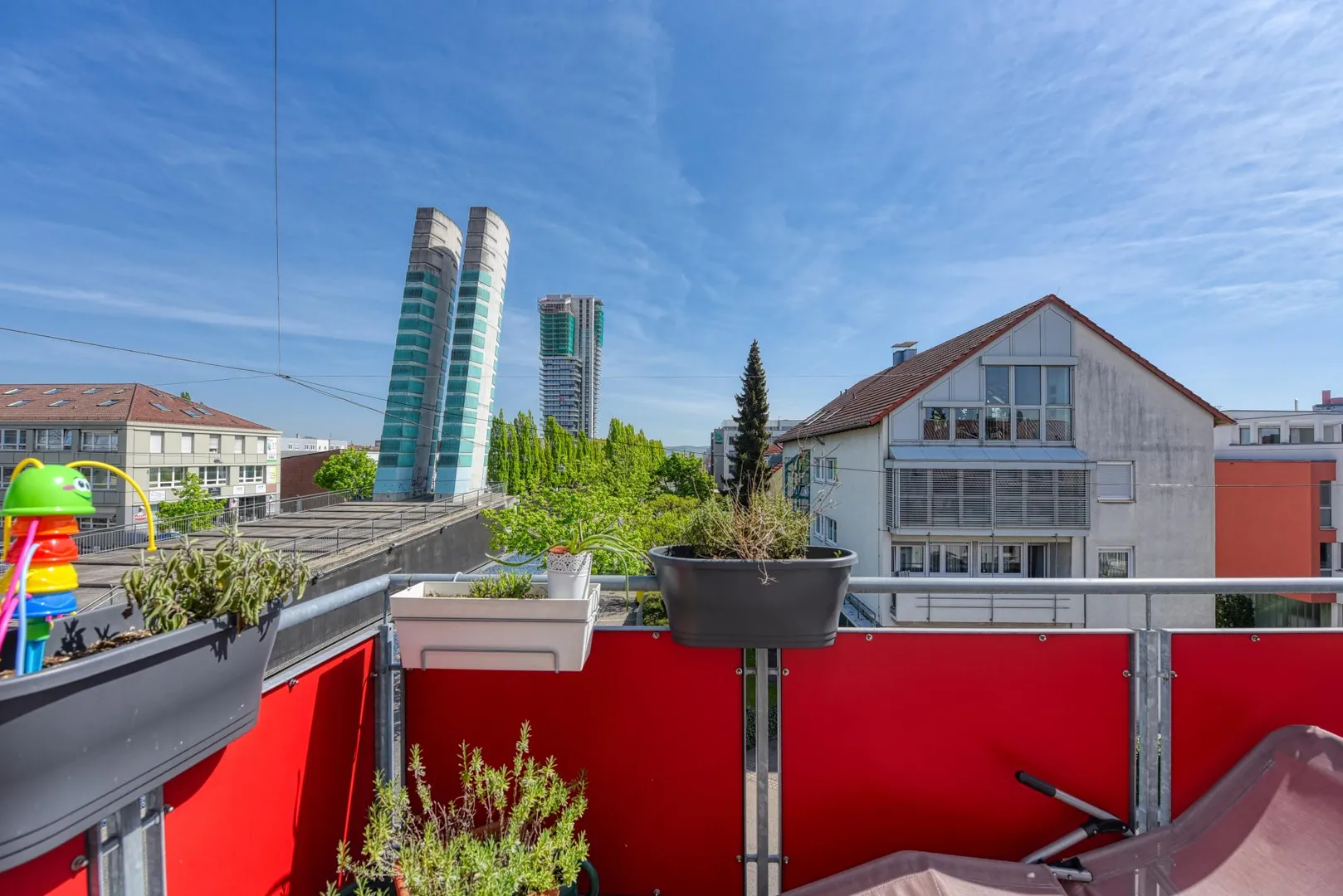 Der ca. 6,5 m² große Balkon ist nach Osten ausgerichtet. Das großzügige Badezimmer verfügt über ein Fenster. Über eine Treppe im Wohnbereich ist der ca. 15 m² große Hobbybereich im Dach-Studio begehbar.