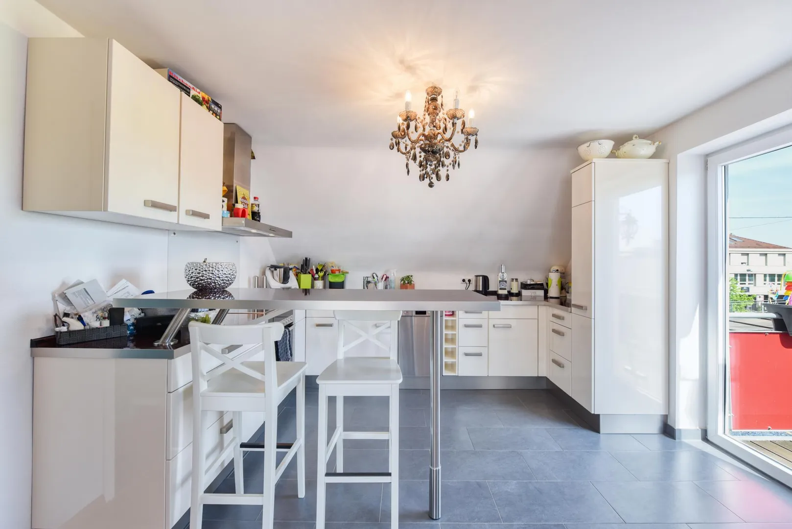 Der offene Küchenbereich ist ausgestattet mit einem Fliesenboden sowie mit einer Einbauküche mit Abzug nach außen. Die hochwertige und sehr gepflegte Einbauküche mit weißen Hochglanz-Fronten wurde 2009 eingebaut und ist ausgestattet mit Herd, Backofen, Dunstabzug, Spülmaschine, Kühlschrank, Gefrierschrank, Theke, Unter- und Oberschränken.