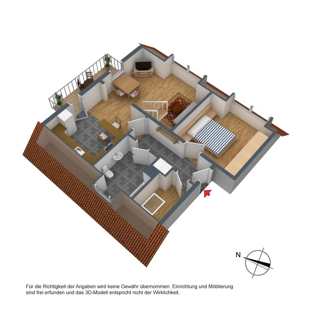 Die Wohnfläche beträgt ca. 60 m² nach DIN ohne dem Hobbybereich im Dach-Studio. Der Hobbybereich verfügt über ca. 15 m² Nutzfläche.