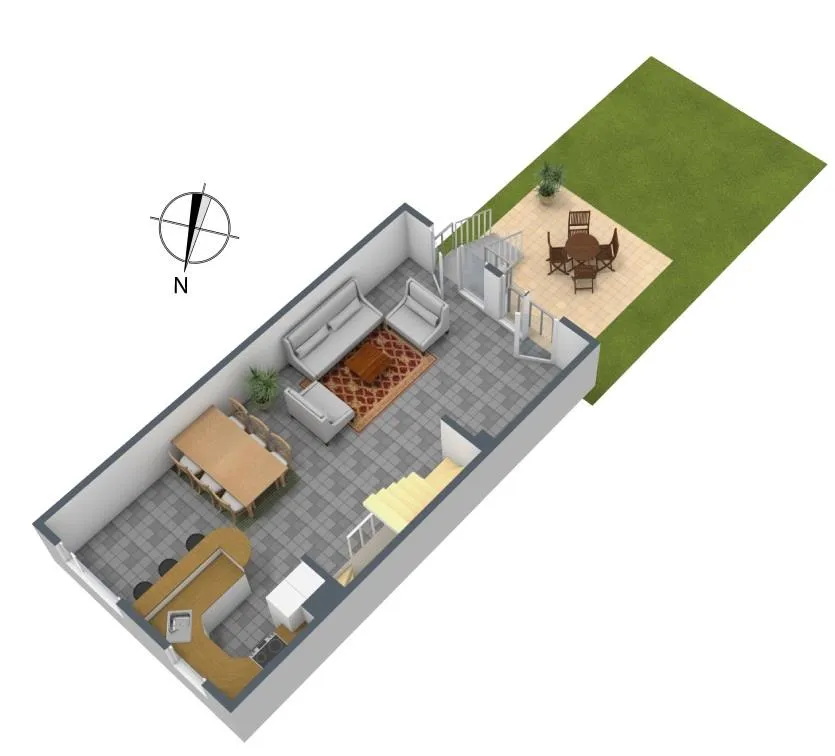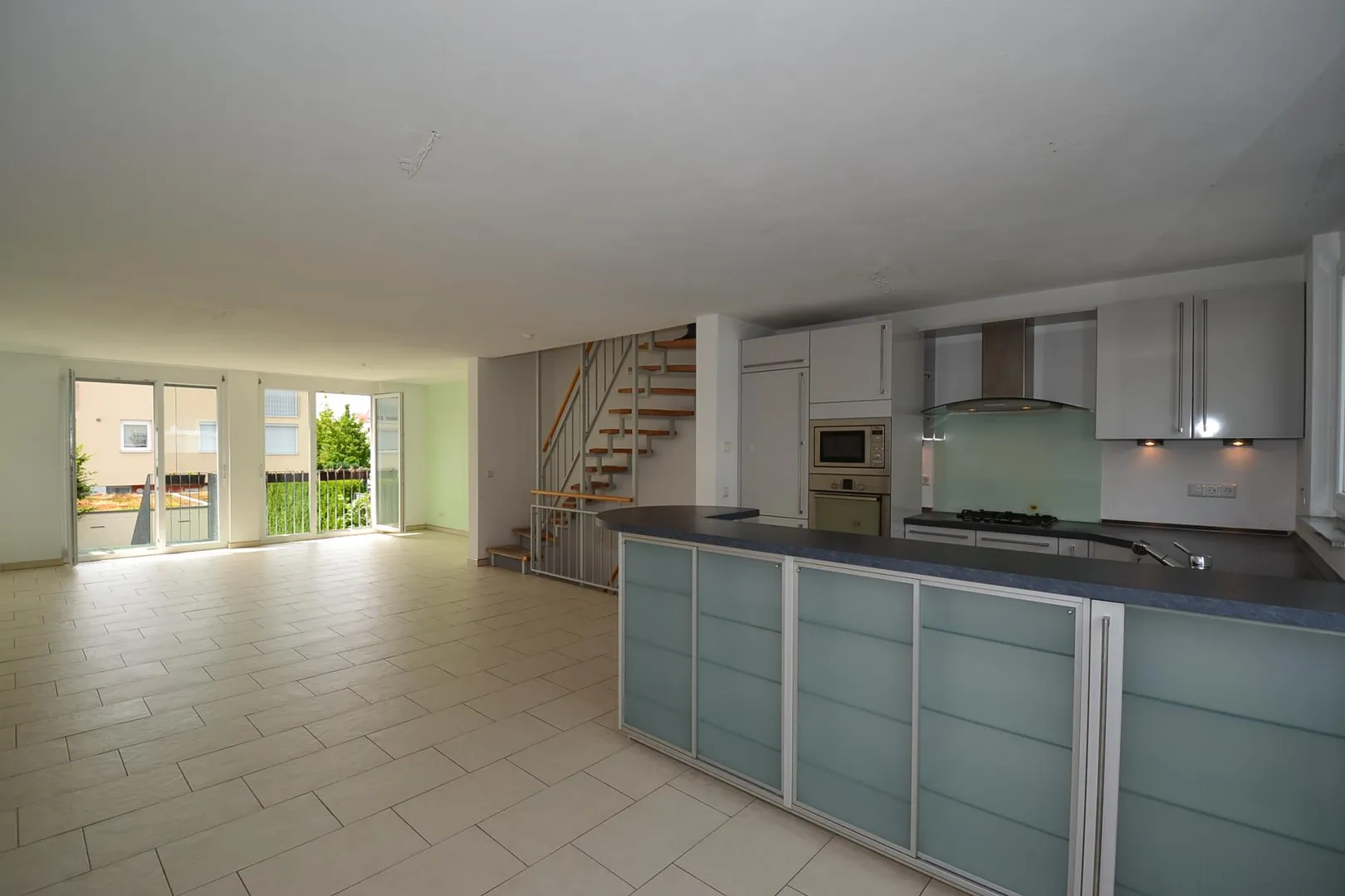 Im Obergeschoss befinden sich ein offener Wohn-/Ess- und Küchenbereich sowie der Ausgang auf die Terrasse und in den Garten. Die offene Einbauküche ist ausgestatte mit Kühlschrank mit Gefrierfach, Gas-Herd mit Außen-Abzug, separaten Backofen, Mikrowelle, Spülmaschine, Theke sowie Ober- und Unterschränken. Die Terrasse und der Garten sind über eine Treppe erreichbar. Der Boden ist gefliest, die Wände sind verputzt. Die Raumhöhe beträgt ca. 2,40 Meter.