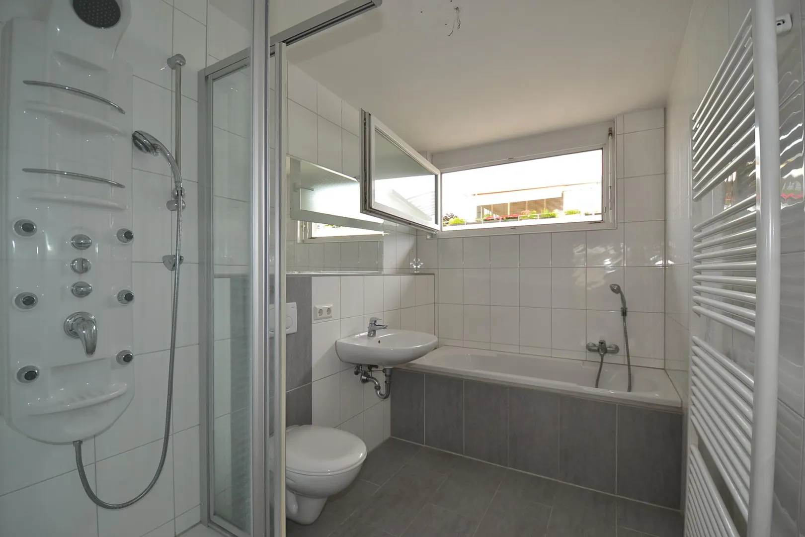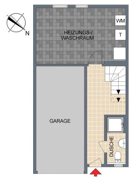 Im Garagengeschoss befinden sich der Eingangsbereich mit Garderobe, ein Badezimmer mit Dusche und Fenster sowie der Technik-/Wasch-/Abstellraum.