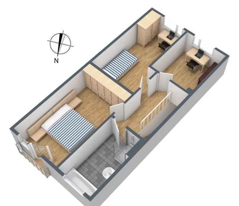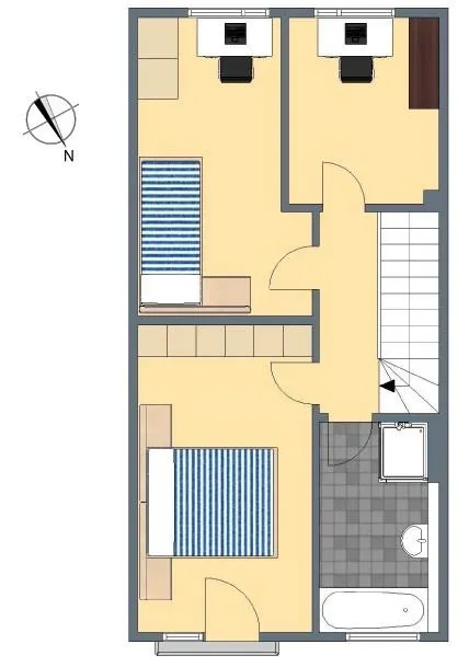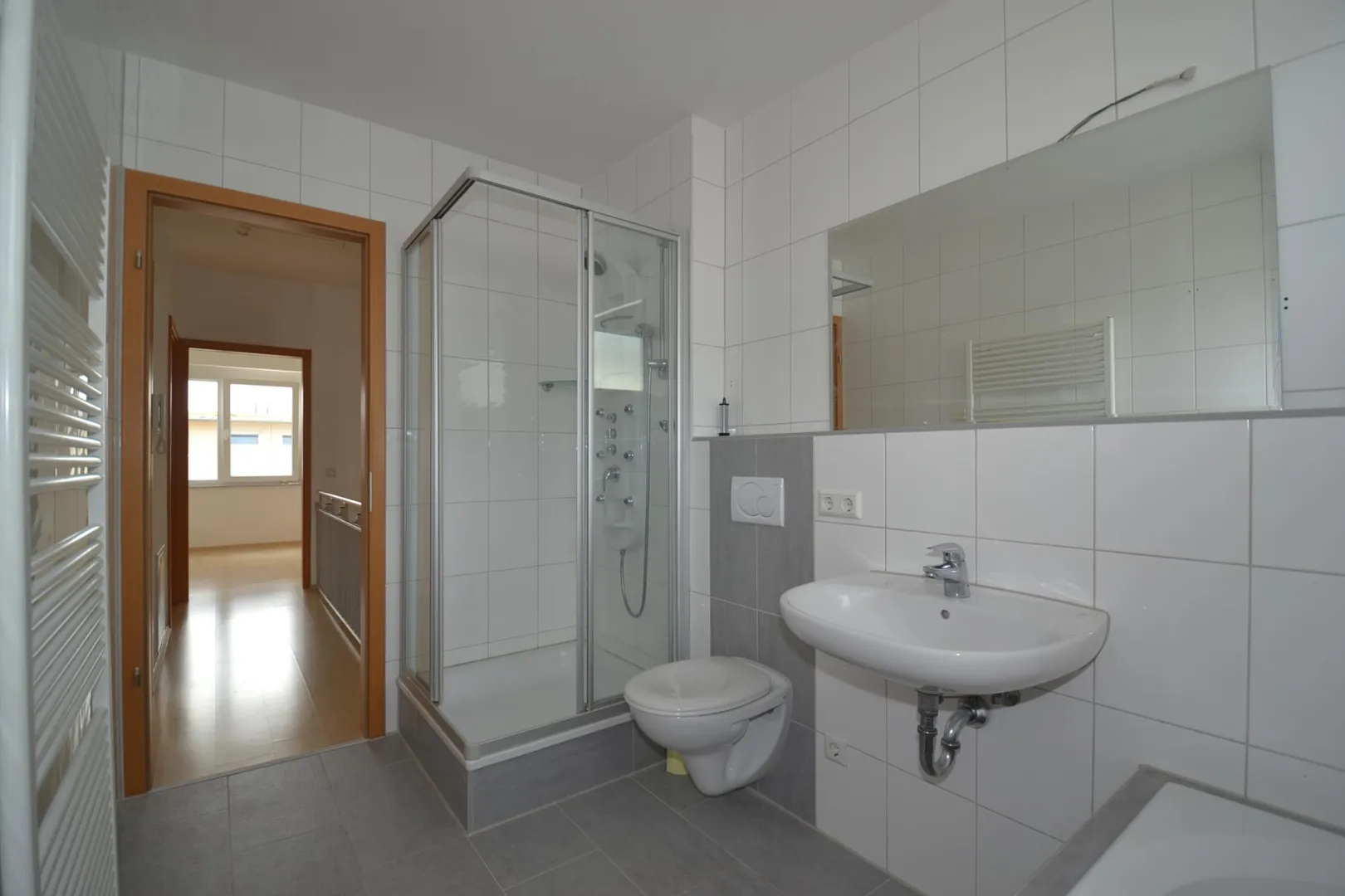 Im Dachgeschoss (ohne Schrägen) befinden sich das zweite Badezimmer sowie ein Schlafzimmer und zwei Kinderzimmer. Das raumhoch geflieste Badezimmer mit Fenster ist ausgestattet mit einem Fliesenboden, einer Dusche, einer Badewanne und einem Handtuchheizkörper. Das Schlafzimmer verfügt über einen französischen Balkon. Die Böden sind mit Laminat ausgestattet. Die Wände sind mit Raufasertapete tapeziert.