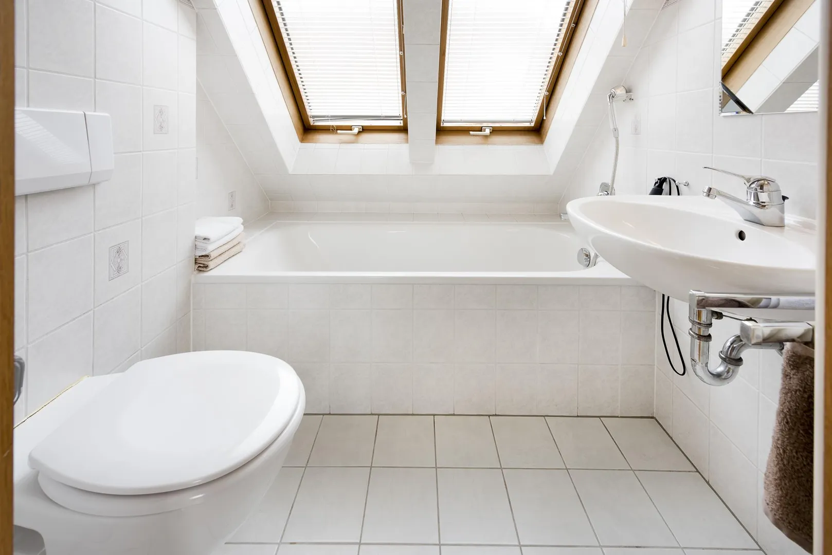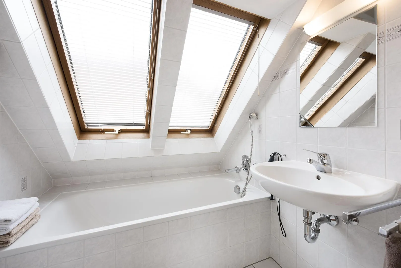 Das raumhochgeflieste Badezimmer mit Fenster verfügt über eine Badewanne, ein WC, einen Spiegel sowie eine Lampe. Die Badewanne befindet sich unter einer Dachschräge. Das Duschen ist nur im Sitzen, Liegen oder in der Hocke möglich.