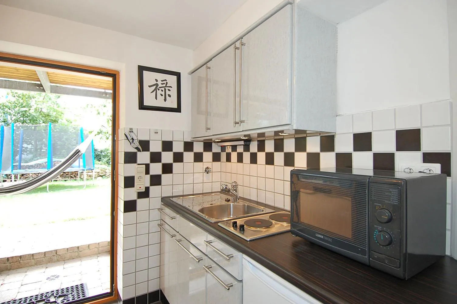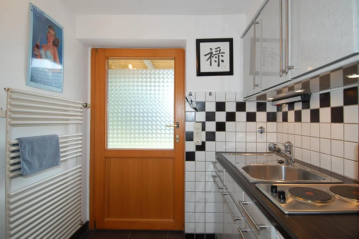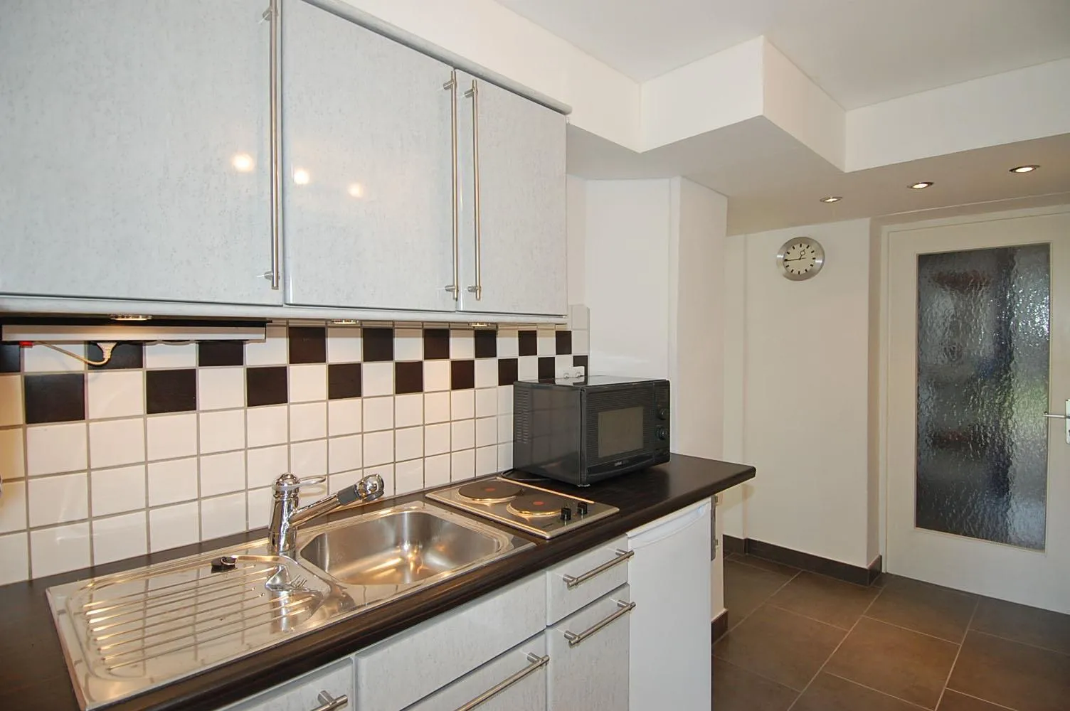 Eine kompakte und gepflegte Einbauküche ist vorhanden. Diese ist ausgestattet mit Kühlschrank, 2-Platten-Kochfeld, Mikrowelle, Spüle sowie Ober- und Unterschränken.