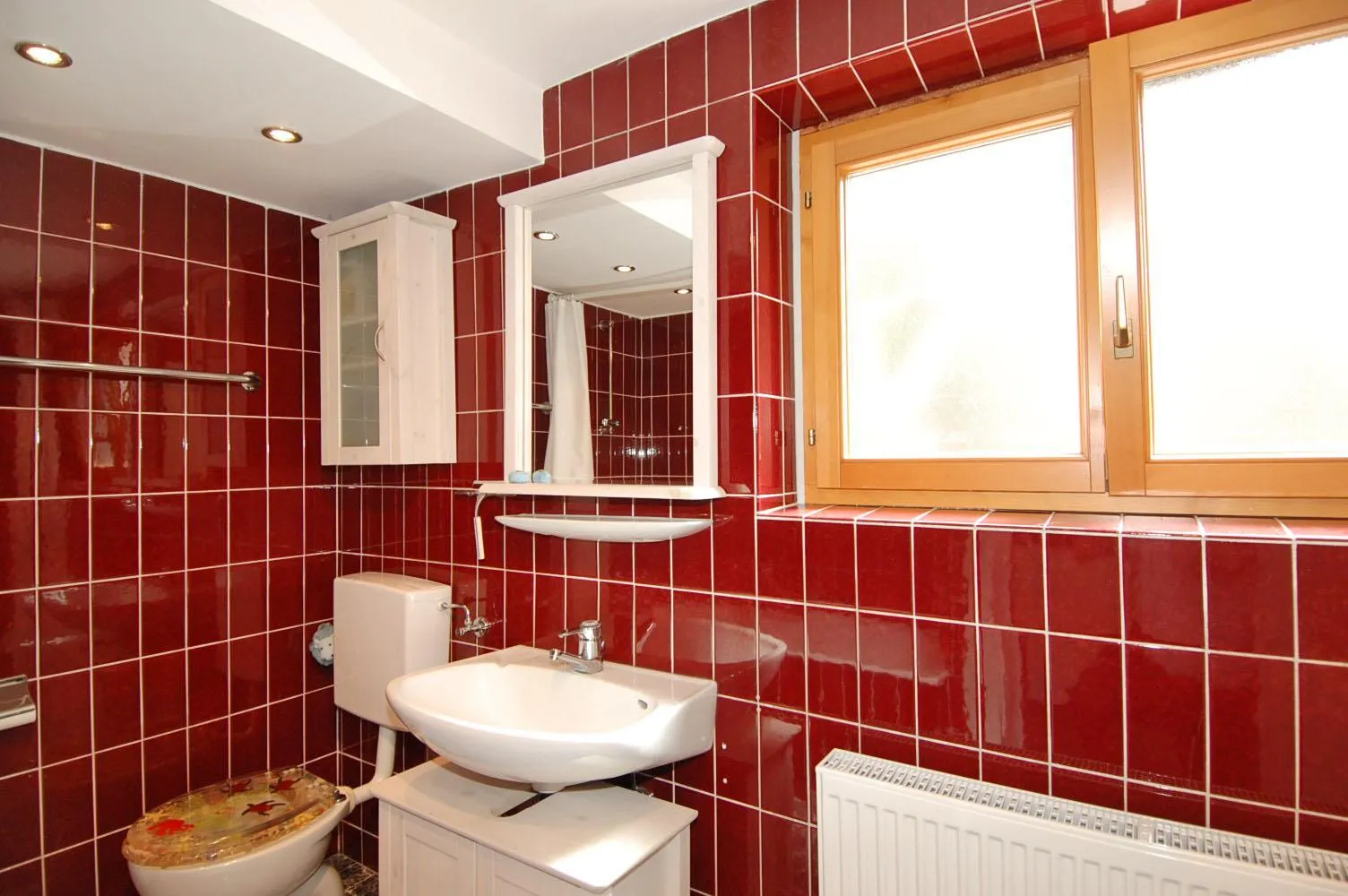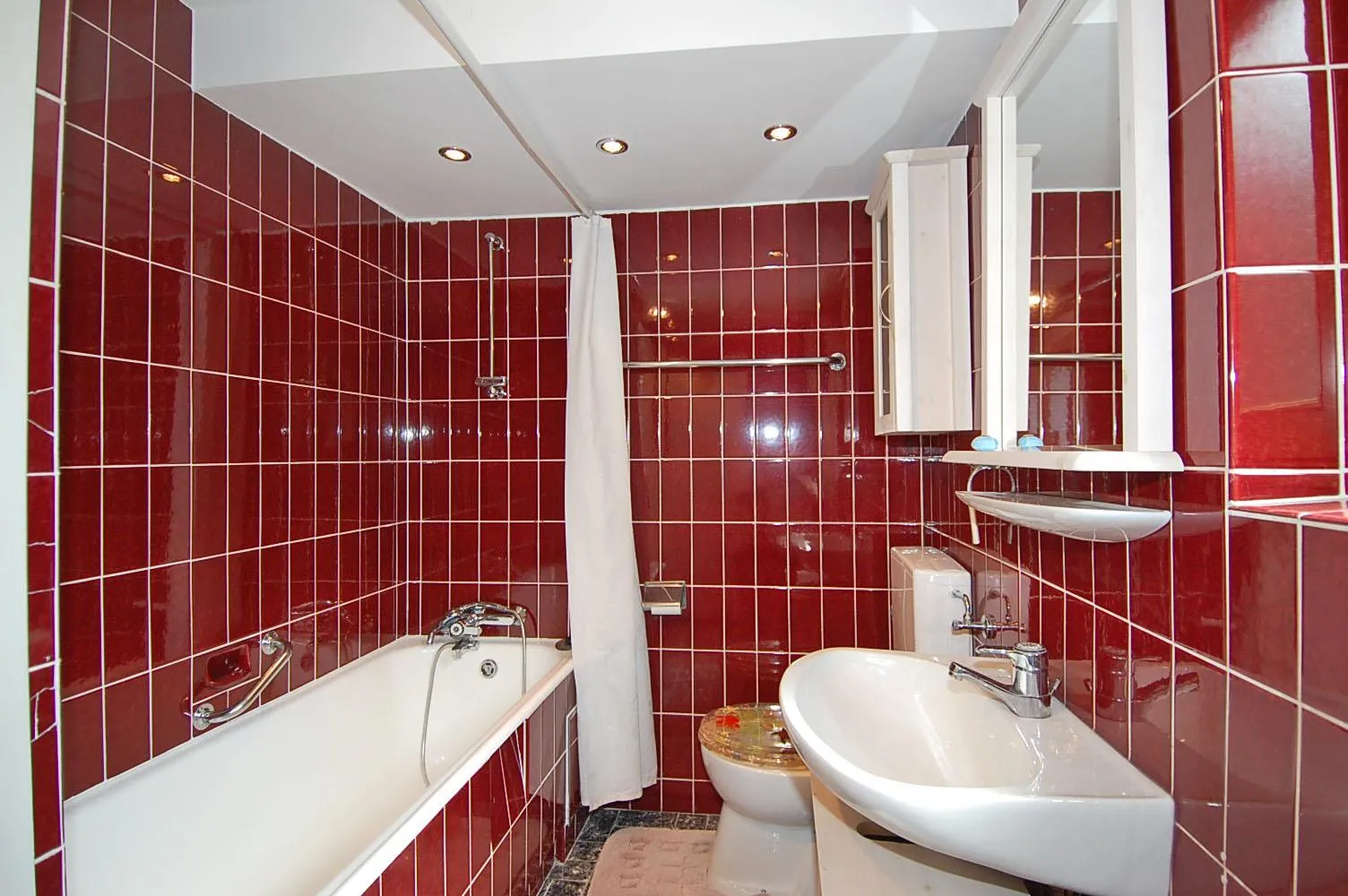 Das große Badezimmer ist raumhoch gefliest (bordeaux-rot) und mit Badewanne, Waschtisch, Waschmaschinenanschluss, WC und Fenster ausgestattet.