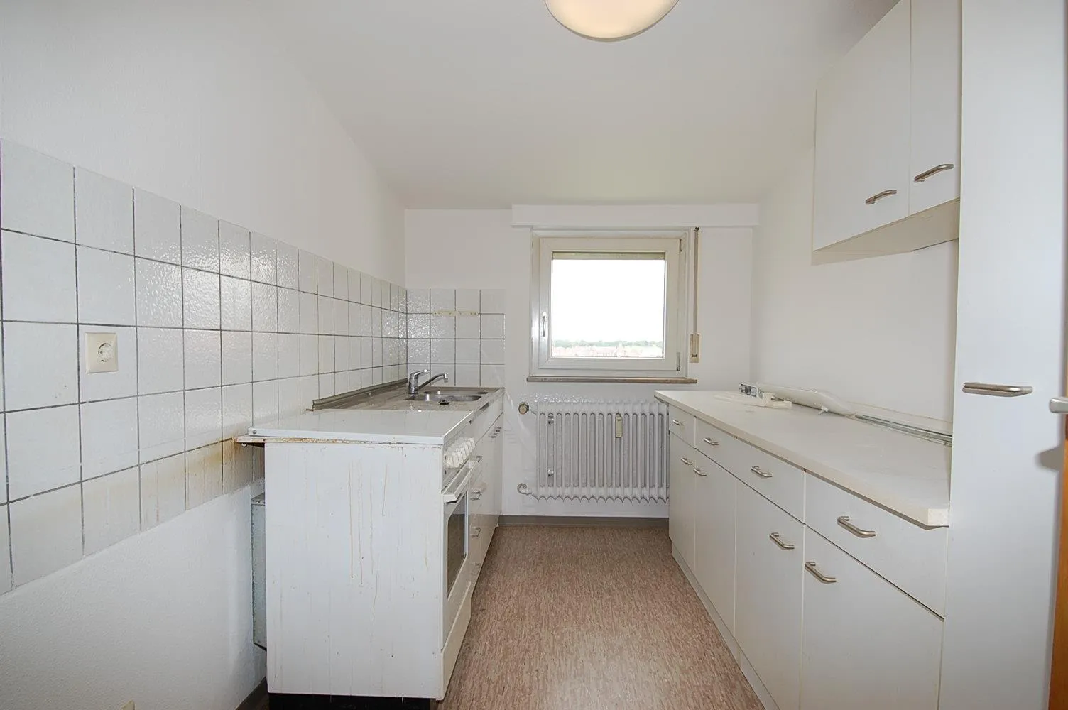 Die Küche ist mit einer Einbauküche ausgestattet. Auf dem Küchenboden ist PVC ausgelegt.