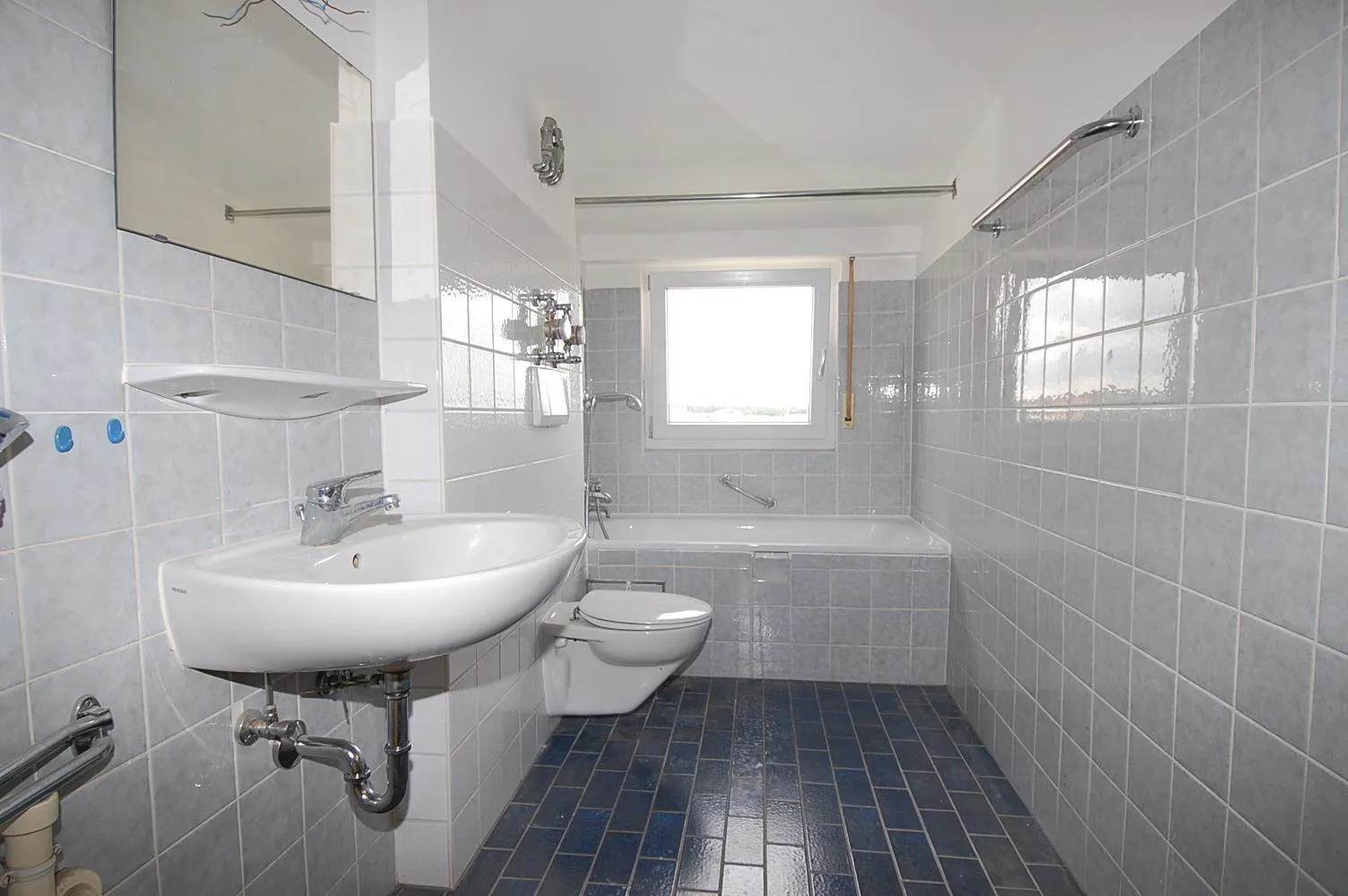 Das Badezimmer ist ausgestattet mit einem Fenster, einer Badewanne, einem WC und einem Waschmaschinenplatz.